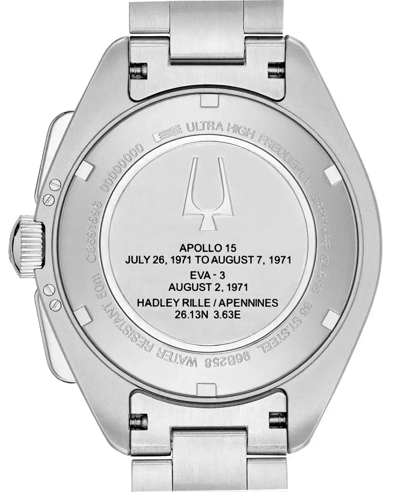 todos estos relojes, también los que ya no están en colección (porque se han discontinuado o eran ediciones limitadas) llevan el mismo movimiento, NP20, que tienen la denominación técnica de HIGH PRECISION QUARTZ, desde hace 4 años, aproximadamente (nosotros llevamos la marca desde enero 2023 y ya se llamaba así), pero hace unos años no tenía este nombre, dígamos, técnico o de marketing. Parece ser que cuando no tenía este nombre, los Bulova Lunar Pilot que se fabricaban llevaban la frase en la tapa HIGH PERFORMANCE QUARTZ, entre otras muchas cosas, incluso algunos llevaban la expresión ULTRA HIGH FRECUENCY (mire la foto oficial de Bulova de la tapa trasera del 96B258 que le mandamos).