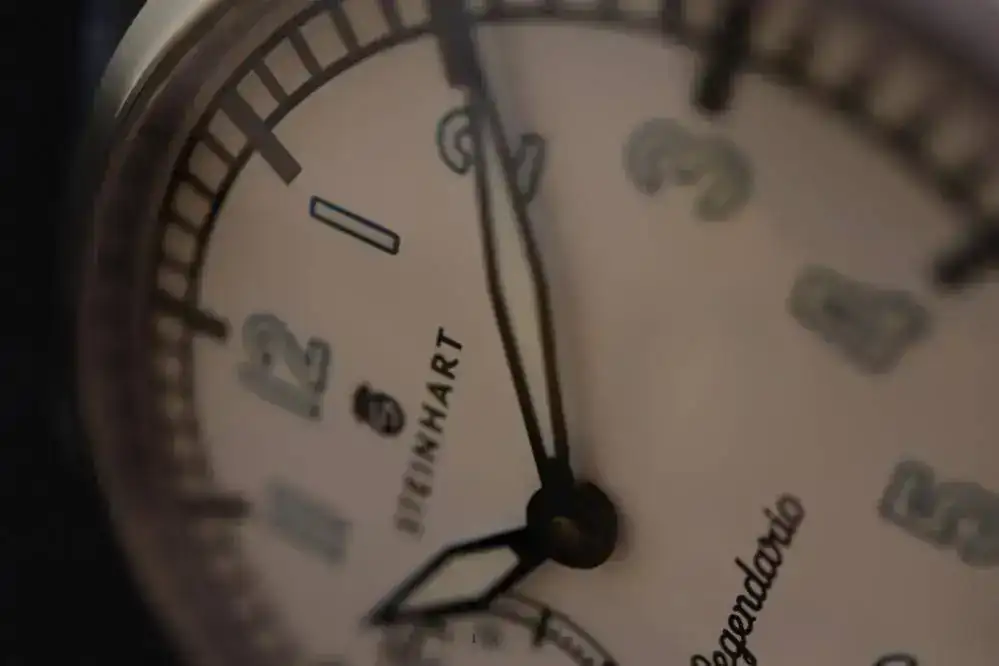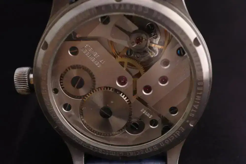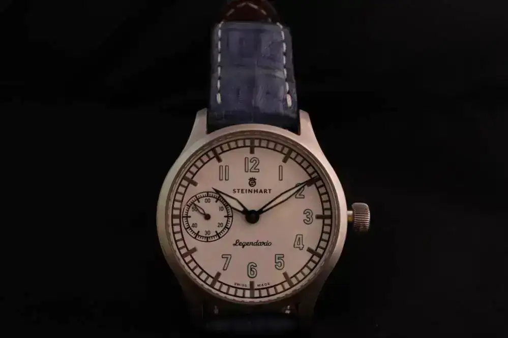 El reloj es grande, contundente con un calibre vistoso, concretamente un Unitas 6497 con sus joyas en azul y rojo. La esfera es clara y diáfana con una sub esfera a la izquierda para marcar los segundos, los números con un color muy bonito y una grafía de vía de tren circular por la que transcurre la aguja minutera y que le da su personalidad, cristal zafiro y una corona firmada por el constructor. El reloj lo produjo la casa Alemana Steinhart, pero el corazón lo pusieron un montón de Compañeros que se lo curraron muy duro. ¡Muchas gracias!