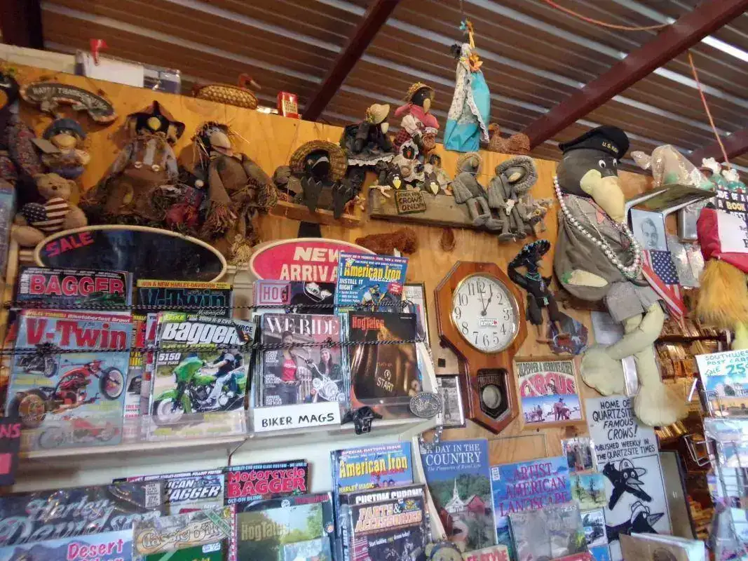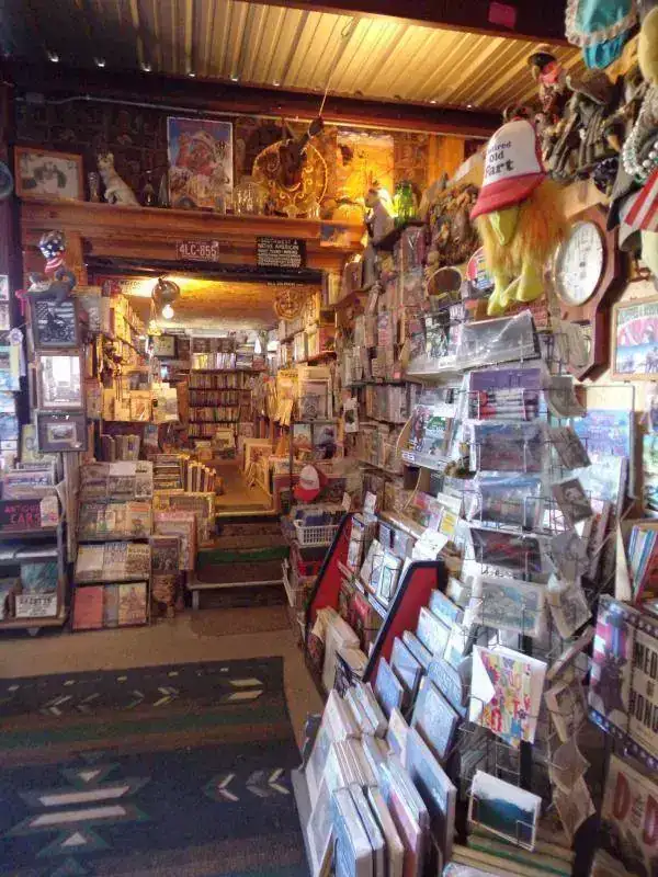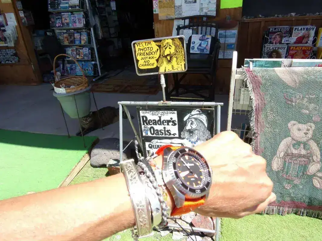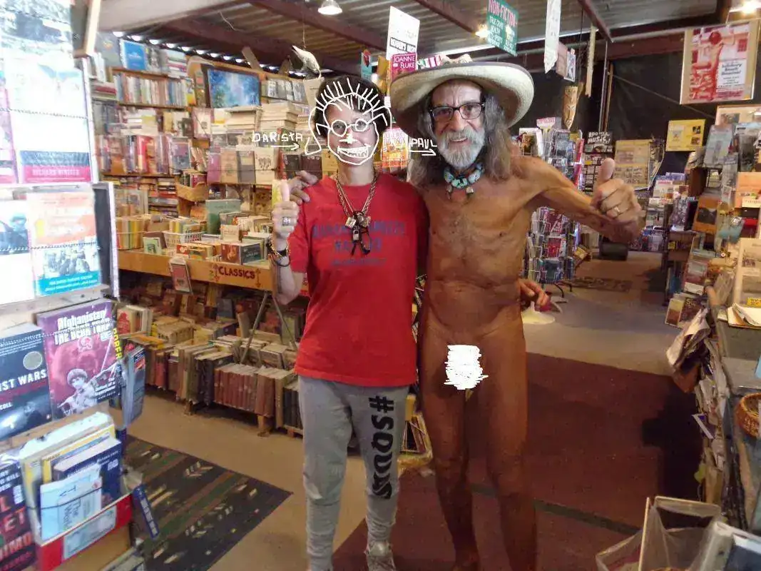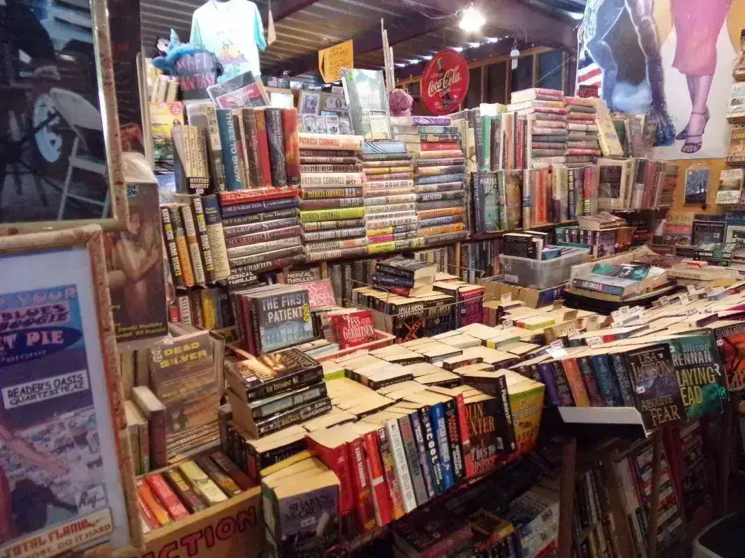 La librería es única por varias razones: en el pueblo de Quartzsite, en el que gran parte del año la temperatura raramente baja de los 40 grados y donde está la librería, viven poco menos de 4 mil habitantes; y creo no hace falta un negocio especializado de volúmenes coleccionables, primeras ediciones y rarezas. Otra razón por la que es única: alejadísima de centros urbanos, no vende online y si uno quiere algo... hay que ir hasta allá y lidiar con el dueño, que atiende desnudo ( solo un diminuto taparrabos lo salva de que la policía se lo lleve detenido ).Y otra razón por la que es única: a su lado hay un chatarrerío completamente abandonado ( su dueño pasan semanas que no va ) pero que está abierto: si uno quiere algo lo agarra y deja el dinero allí, dentro de una caja.
