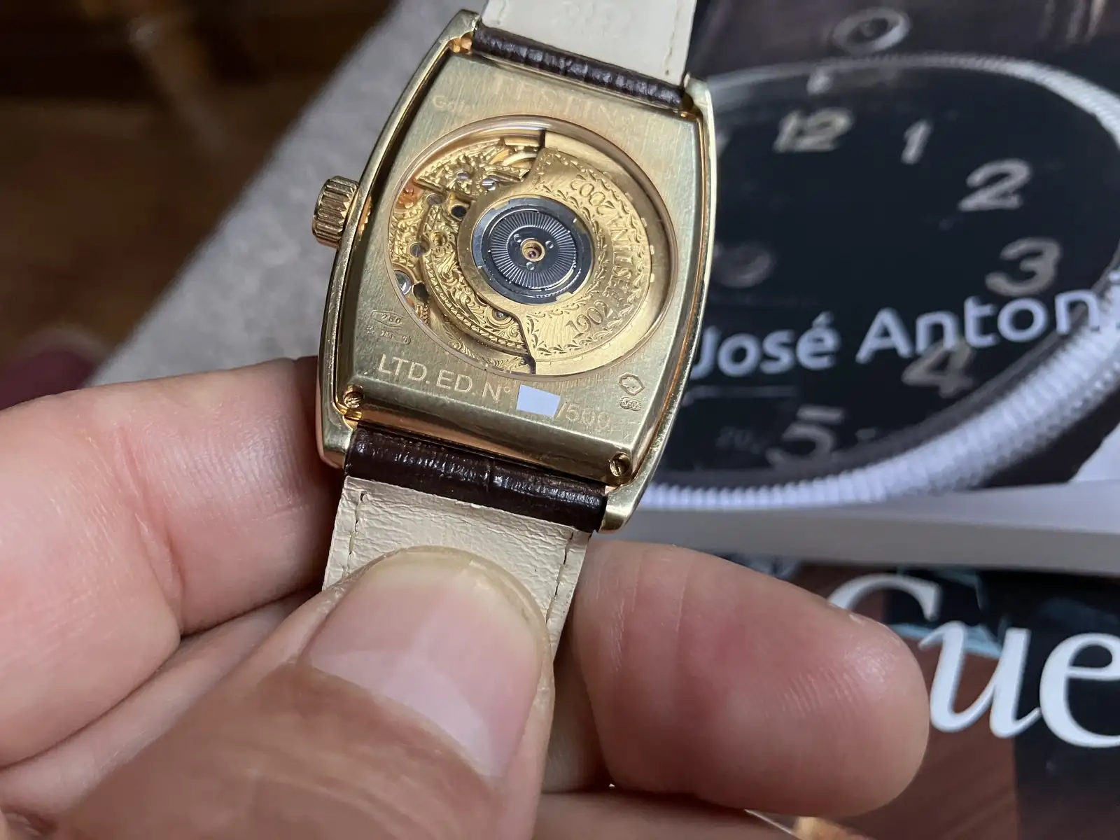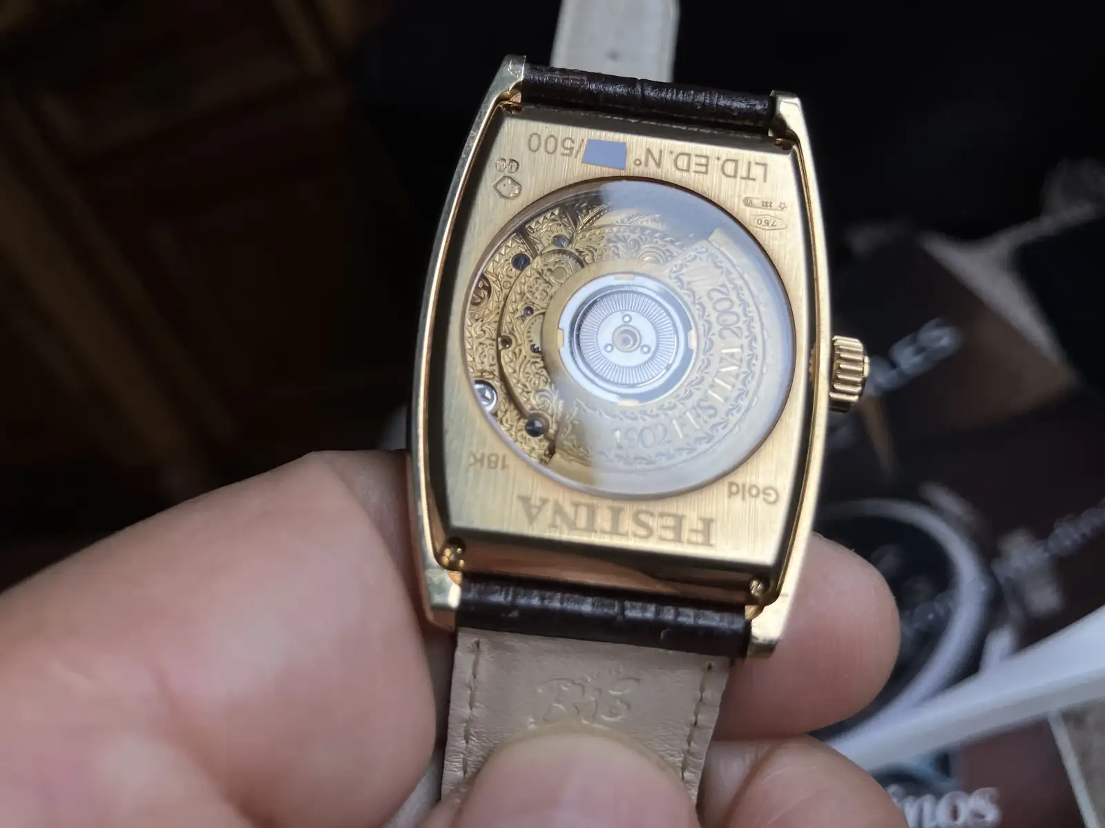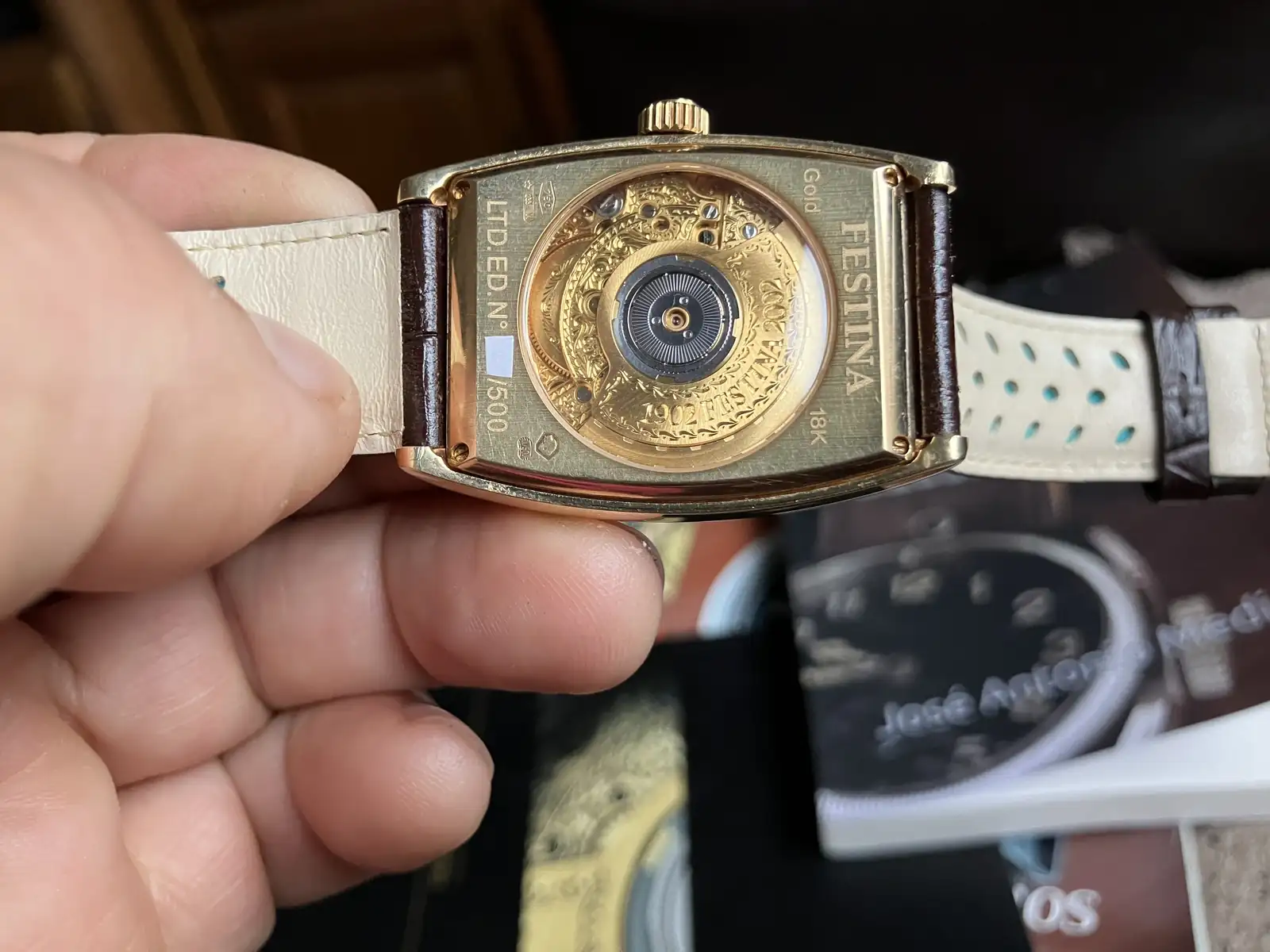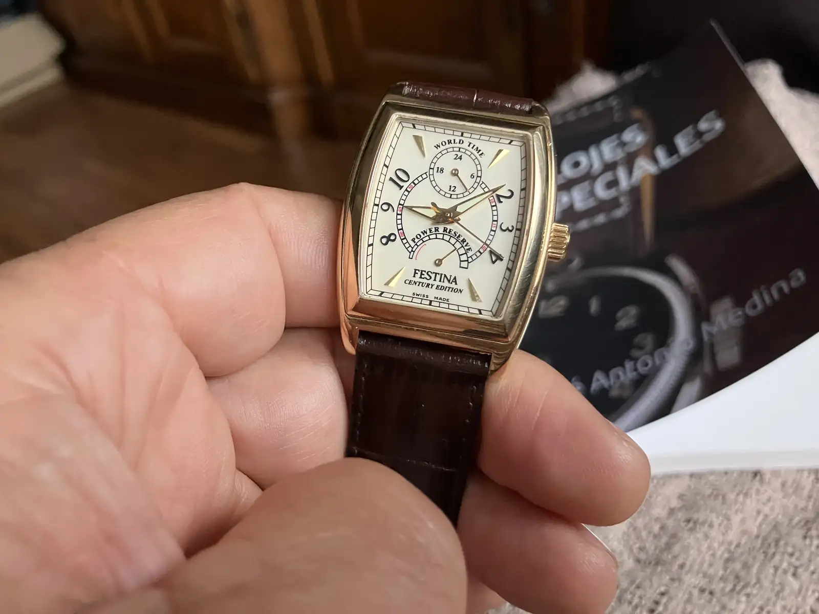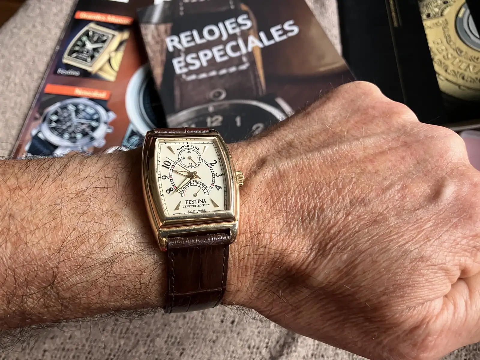 El reloj que presento, un Festina edición centenario de 2002, y es especial porque en 2002 cuando lo vi en una revista que se llamaba RE (relojes y estilográficas, no Relojes Especiales, casualidades de la vida) me dejó loco, GMT, indicador de reserva de marcha. trasera vista con la maquinaria grabada toda a mano... En aquellos años no había mucho con esas características.