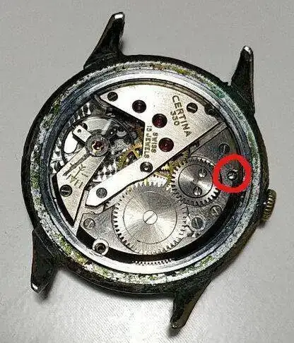 Me dispongo a limpiar estéticamente este Certina 330, del año 1958, y me encuentro con un problema un tanto ridículo. Desatornillo unas cuantas vueltas lo que yo creo que es el tornillo que libera la tija (marcado en rojo) y no sale. No quiero seguir dándole vueltas porque creo que ya ha llegado al límite y no me apetece desengancharlo del tirete.