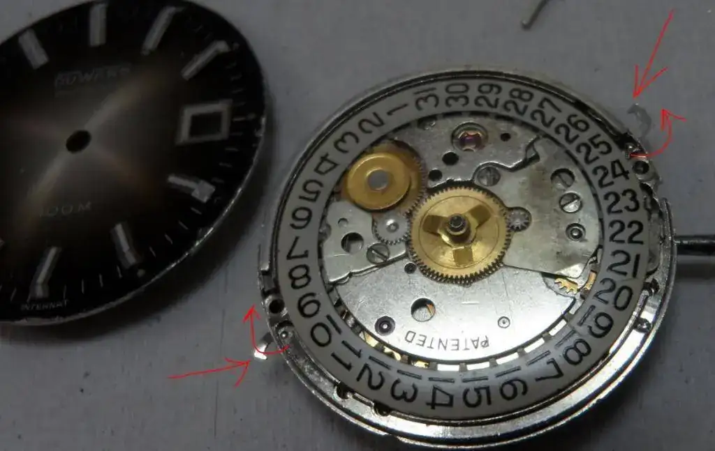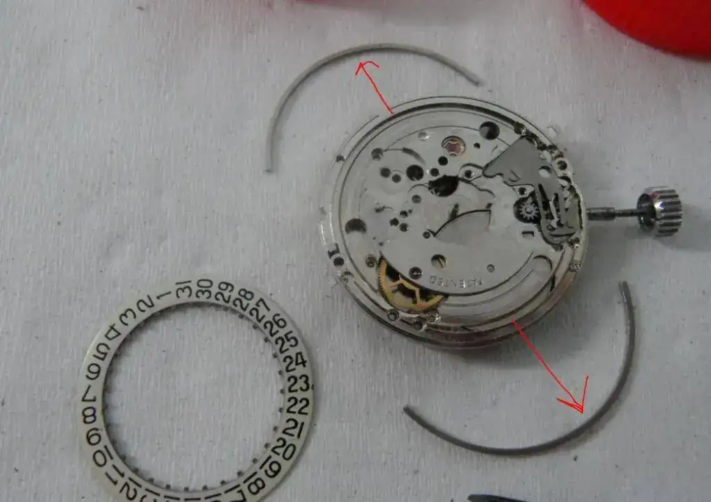 Retiro los dos medios arcos de tope de la esfera para que deje libre la rueda del calendario y no se vea bloqueada por la presión de la esfera.