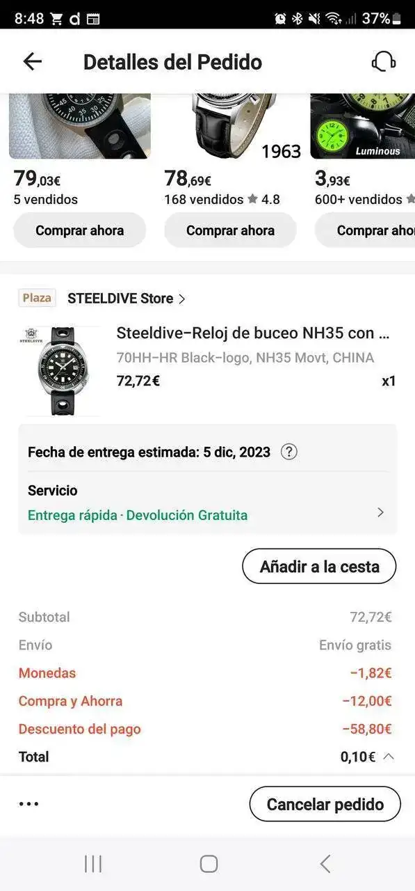Bueno ya lo he devuelto ahora tocara esperar a ver si responden a estos fallos como deben,ya que el error es de ellos y demostrado queda con las fotos les he mandado.Esta madrugada, con nocturnidad y alevosia 😀 pedí un Steeldive sd1979 por casi 94€. Parece que ya lo han mandado.