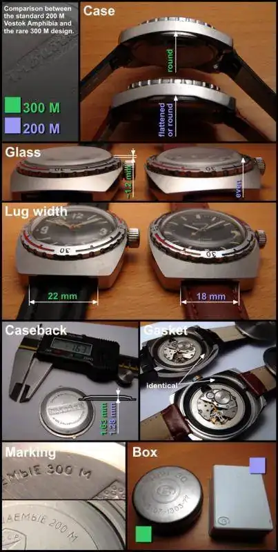 Los modelos 300m se han reeditado sobre lo que eran las cajas 350(asas móviles) que fue el primer modelo de amphibia y la posterior 119 Ambas vintage; en esta última si que había pequeñas diferencias entre los dos modelos, pero básicamente los 300 tenían un plexi más grueso y la trasera idem. también difería el ancho de asas que pasaba de 18 a 22mm en los dos casos. Ambos modelos de caja son vintage. Los modelos 300m siempre se desarrollaron a posteriori de los modelos 200m. Que los modelos 300m se dedicasen a uso exclusivo militar, es más leyenda urbana que certeza, ya que no hay ningún documento que lo certifique y se construyeron aparentemente muy pocas unidades(unas 300 de cada versión) tampoco hay ningún amphibia vintage 300m, con la inscripción el el dial, tapa o caja 3AKA3 MO CCCP que certificaría el encargo del ministerio de defensa.