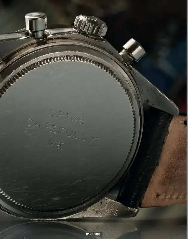 No obstante todo esto, fue Joanne la que compró el reloj y se lo regaló, con aquella inscripción cariñosa de preocupación por su recién descubierta pasión por el volante: “Drive carefully, me” (la coma la he puesto yo). Se dice que el reloj fue comprado en Tiffany & Co, NY. No he visto evidencia de ello pero está claro que no todos los Rolex que vendía la mítica tienda tendían doble firma, por lo que podría ser.