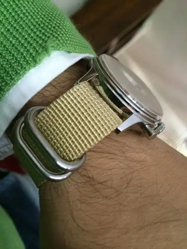 ¿Viene con correa de piel ahora? Solía venir con una nato que le iba estupenda. Esa Zulu le queda bien, sinceramente me gusta el color, pero por las dimensiones del reloj, yo utilizaria una nato, no una zulu. Pero, evidentemente va en gustos. De pura casualidad llevo el mismo reloj hoy. La Morellato "Jump", es ideal, en mi opinión. También las canvas. Yo pillé un par de canvas de Timefactors, muy sencillas y muy baratas, que le sientan muy bien y no desentonan con el tono más bien retro del reloj. Luego somos varios los que lo hemos usado con bund. Es una opción para que ven el reloj algo pequeño (no es mi caso). Yo he posteado una que me hizo José María de CB straps en otro post en el que se conversaba sobre correas para el 1963.
