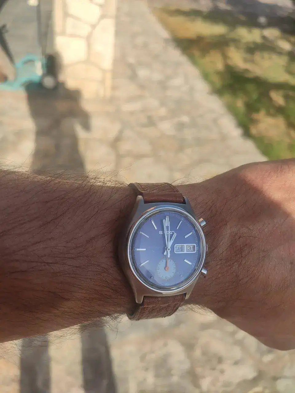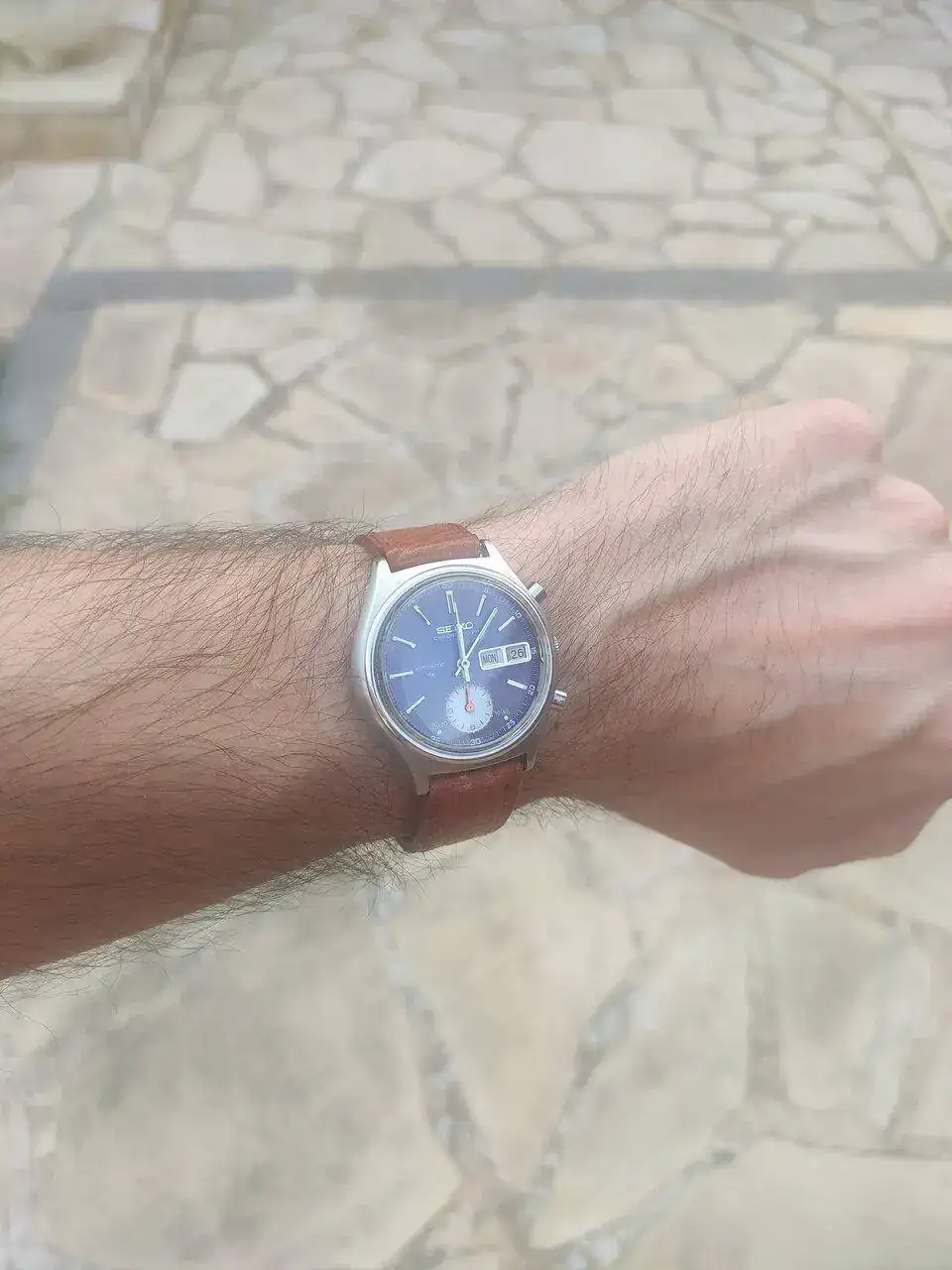 El modelo es un Seiko 7016-8001 y monta un calibre 7016a con función de día y fecha y cronógrafo flyback. Después de éste me declaro fan acérrimo de los tamaños contenidos, uno de los puntos que más me gustan son sus 38 mm. La combinación de colores de la esfera añil y aguja naranja me resultó muy atractiva y el impecable estado de la caja decantó su compra.