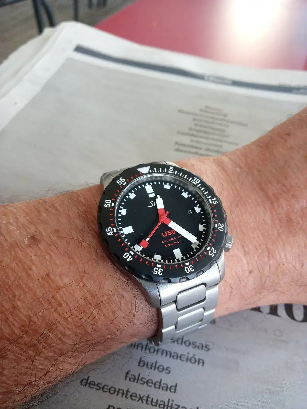 Gracias por compartir, me gusta mucho, con su inconfundible estilo Sinn. Que lo disfrutes mucho.Antes de lo esperado (me dijeron 11 semanas de espera y han sido 6) os presento el Sinn U50 (una versión reducida del U1 que salió al mercado en 2014). Buscaba un reloj todoterreno/herramienta/ diver de medidas contenidas (muñeca de 17cm) y que su diseño se apartara de la estética submariner o skindiverl. Tras descatar muchos modelos por sus dimensiones o diseño (oris,tudor,seiko,doxa,longines,etc) me topé con este Sinn y fué el elegidol, no podía probármelo pues en mi ciudad no hay CO de Sinn pero sabiendo sus medidas (11mm x 11mm x 47mm casi identicas al omega seamaster q tengo) me lancé a por el (a través de Iguanasel con trato muy correcto). No voy a abundar en sus características pues estan en la web y multiples review en youtube (acero submarino, sellita sw300, 500m wr, etc). La sensación en la muñeca es muy buena, casi igual al omega pero 1mm más bajito. La corona a las 4 es también cómoda pues no se clava en el dorso de la mano. El único aspecto mejorable es el cierre del brazalete (q no es malo y tiene 3 agujeros de microajuste, el omega no tiene ninguno). Quitar eslabones es muy cómodo pues estos van atornillados y Sinn te suministra dos llaves allen para hacerlo. La distancia entre asas es de 20mm y éstas vienen perforadas para facilitar el cambio de correas/brazalete. Hasta aquí mis primeras impresiones en los dos primeros días q lo tengo. Un saludo a tod@s.Ver el archivos adjunto 2349791Ver el archivos adjunto 2349792Ver el archivos adjunto 2349793Ver el archivos adjunto 2349794