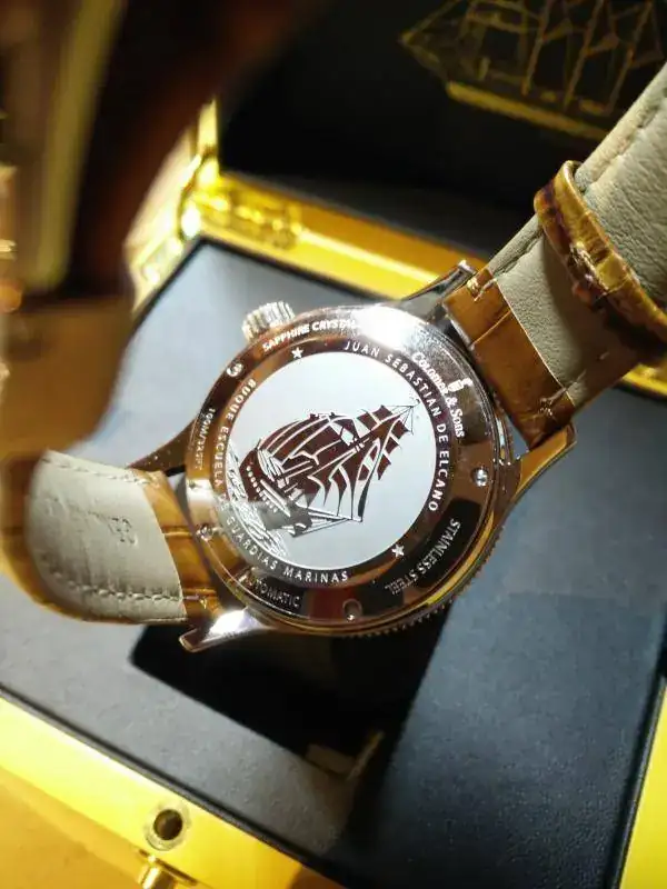 Pasamos al reloj. Movimiento Miyota 8215. Caja de 40mm. Acero inox 316L. Corona a rosca. Zafiro. Correa de cuero italiano con cierre de mariposa. Sumergible a 100m. Fechador (sólo número).