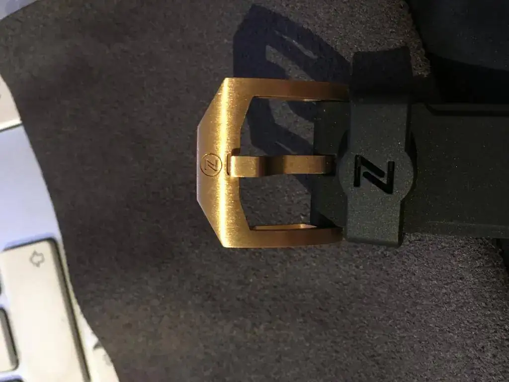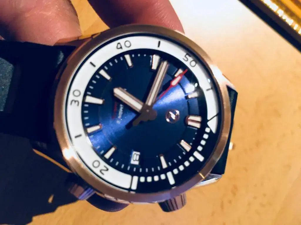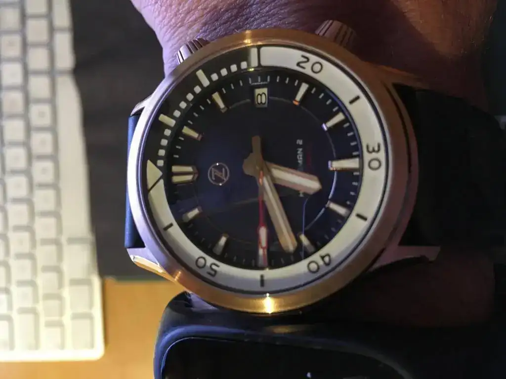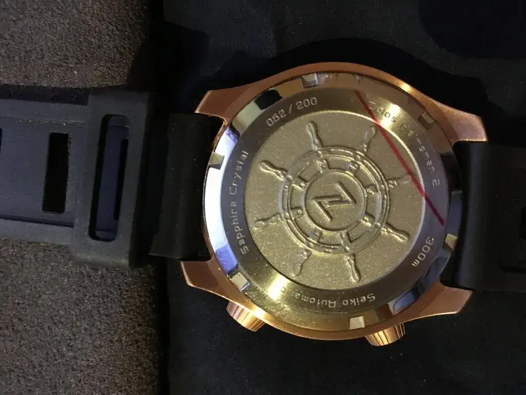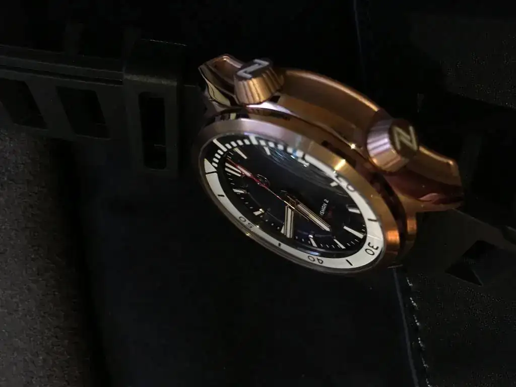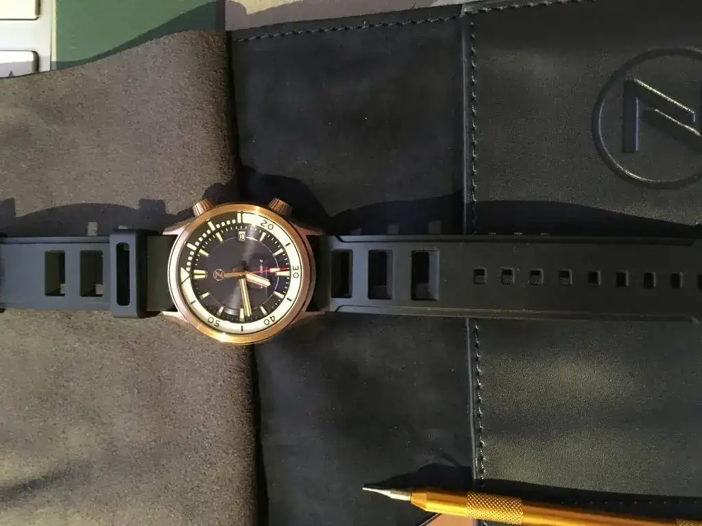 Es un reloj como digo contundente, que ocupa tanto por la parte del reloj como por la parte de la hebilla. Es sumergible a 300m. Cristal de zafiro y bisel interno giratorio. Bronce. En fin, es bastante completo. No tengo una muñeca ancha pero no parece un reloj grande. Veremos como se comporta.