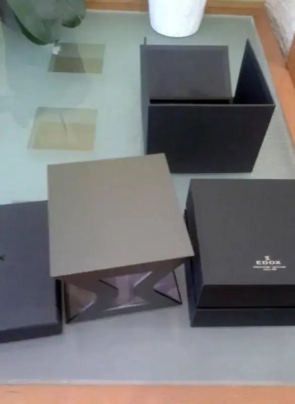 . La caja menuda presentación, una caja dentro de otra, con el logotipo de Edox en metal y dentro..... la caja del reloj, unos detalles en la presentación de 10.El reloj una maravilla, los acabados increíbles, los materiales que han usado para la caja, correa, etc, de primera calidad, como comento me ha sorprendido, vamos que me gusta este reloj hasta para mi