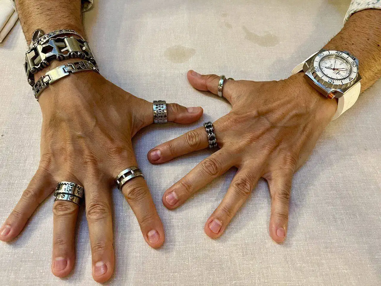 Si yo llevara anillos serían de acero; muy originales. Y esos brazaletes de herramientas molan un huevo.El reloj siempre está solo, aislado… ahora bien, el resto ya tal… 😜🤟🏼
