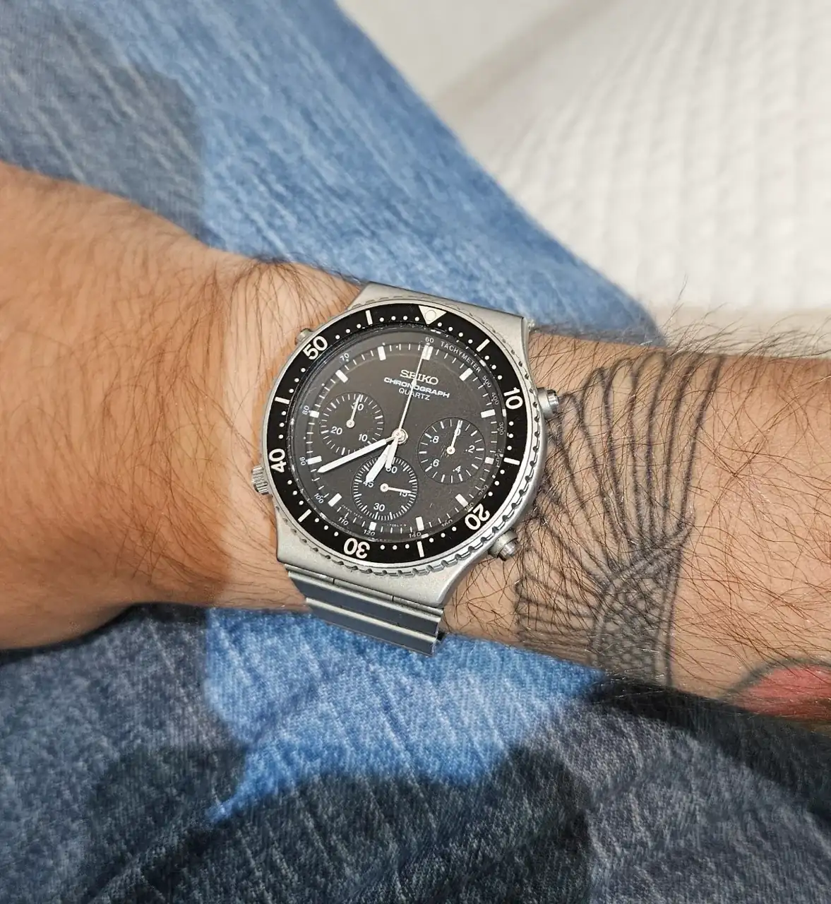 El reloj es alucinante, porque la caja, que es de acero con acabado arenado, no tiene un arañazo, el cristal está bastante limpio (típicos micro swirls que se ven con luz artificial pero en vivo nada), y el bisel de aluminio está perfecto. Encima, el bisel hace unos clicks súper satisfactorios y no tiene apenas holguras. De tamaño, me queda ideal. Me encanta, la verdad.