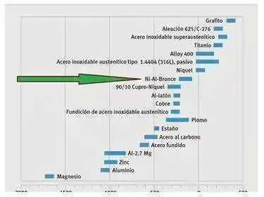 Aquí dejo tabla de resistencia a la corrosión de los metales donde se vé que el bronce está por debajo del acero inoxidable y titanio, pero por encima del hierro (acero) y latón, usado también en la manufactura de muchas cajas de relojes en precios mucho más asequibles