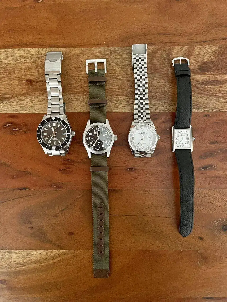 Por lo que actualmente se compone de 4 piezas (las que utilizo) + 1 (guardada por valor sentimental). El Datejust 36mm, el Tank, el SPB143, y ahora esta Hamilton Khaki Field que tan buena pinta tiene.