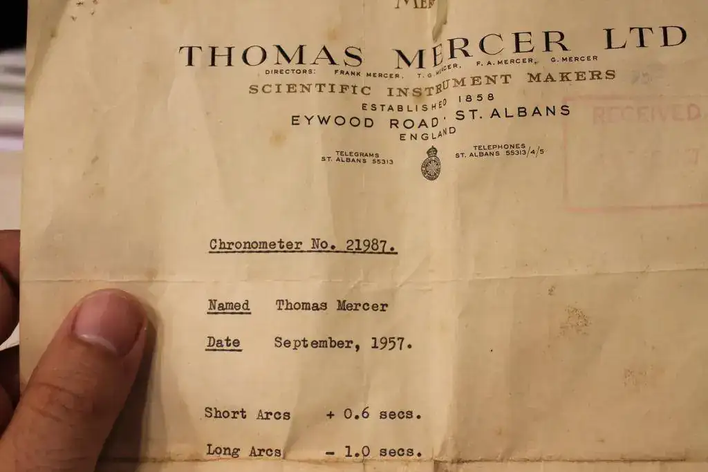 Buenos días a todos, me acabo de agenciar este estupendo cronógrafo marino Thomas Mercer!!!! el precio a sido de auténtica ganga (de esas que sabes que en todo la vida no volverán a ocurrir), con la documentación de fabricación del año 1957, la verdad es que mi padre que es relojero con mas de 50 años de oficio lo a estado revisando y dice que esta impecable, lo único que tiene es la cadena de la cuerda jodida, ahora toca desmontar la maquinaria y limpiarla, dejar todo en orden y listo!!!, ya estoy deseando meterlo en la colección de relojes antiguos "aunque este no lo sea mucho".