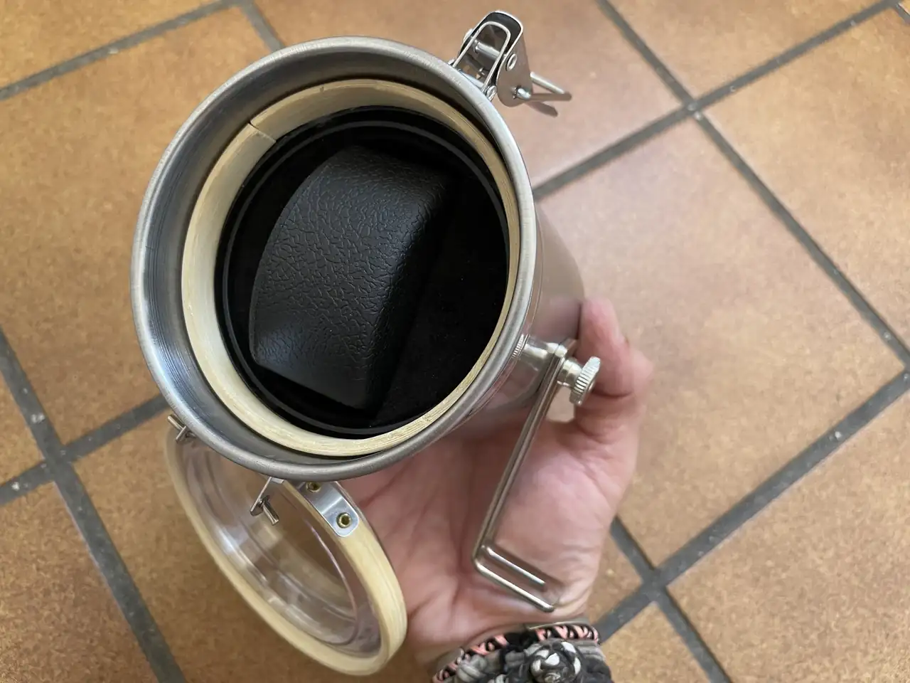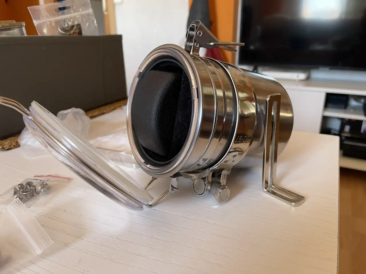 Unas escuadritas, tornillos y tuercas bonitas, un bastidor de punto y una abrazadera que después la descarte en aras de un resultado más estético. Después de varias mediciones con el calibre encontré el interior perfecto en la parte móvil de un watchwinder. Al principio pense en rizar el rizo e incorporarle el motor para hacerlo watchwinder pero sabía que era complicar el diseño y además no soy de usar rotores.