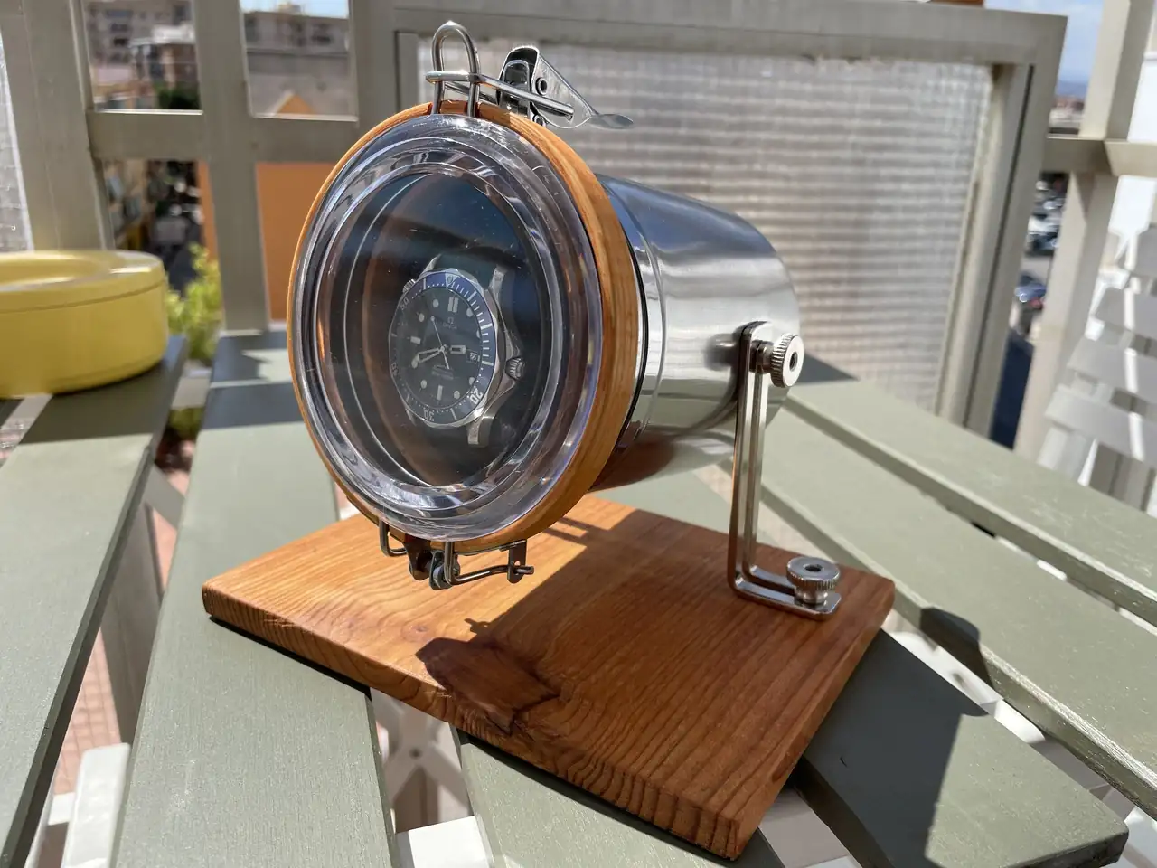 Aqui os muestro el resultado final de esta excentricidad de científico loco🤣🤣, la parte donde descansa el reloj se puede girar manualmente para adaptar el reposo del reloj a la posición más favorable para la desviación.