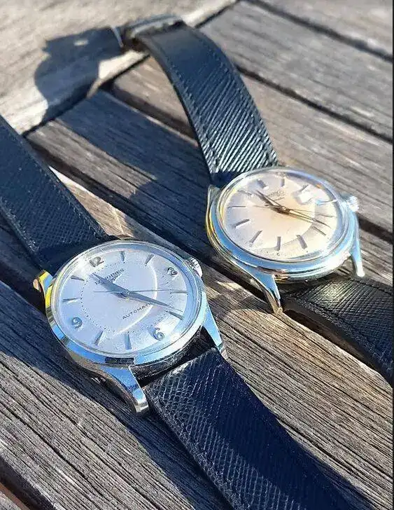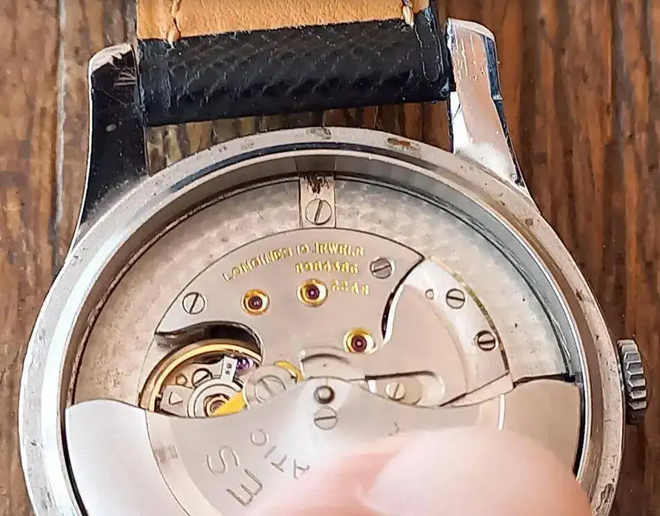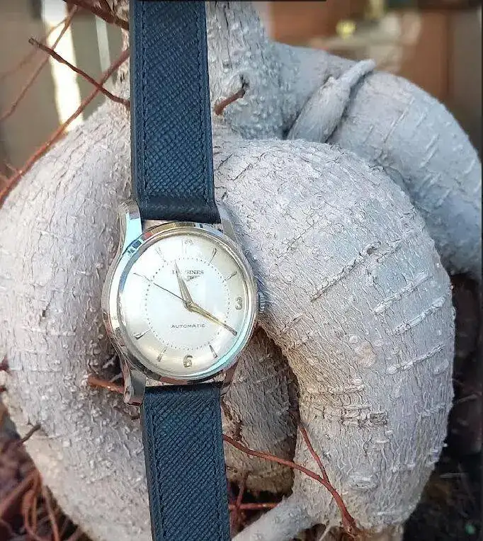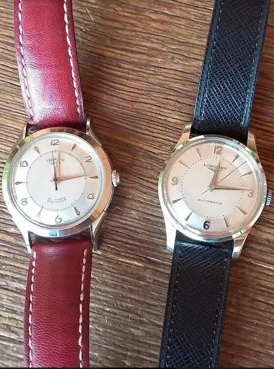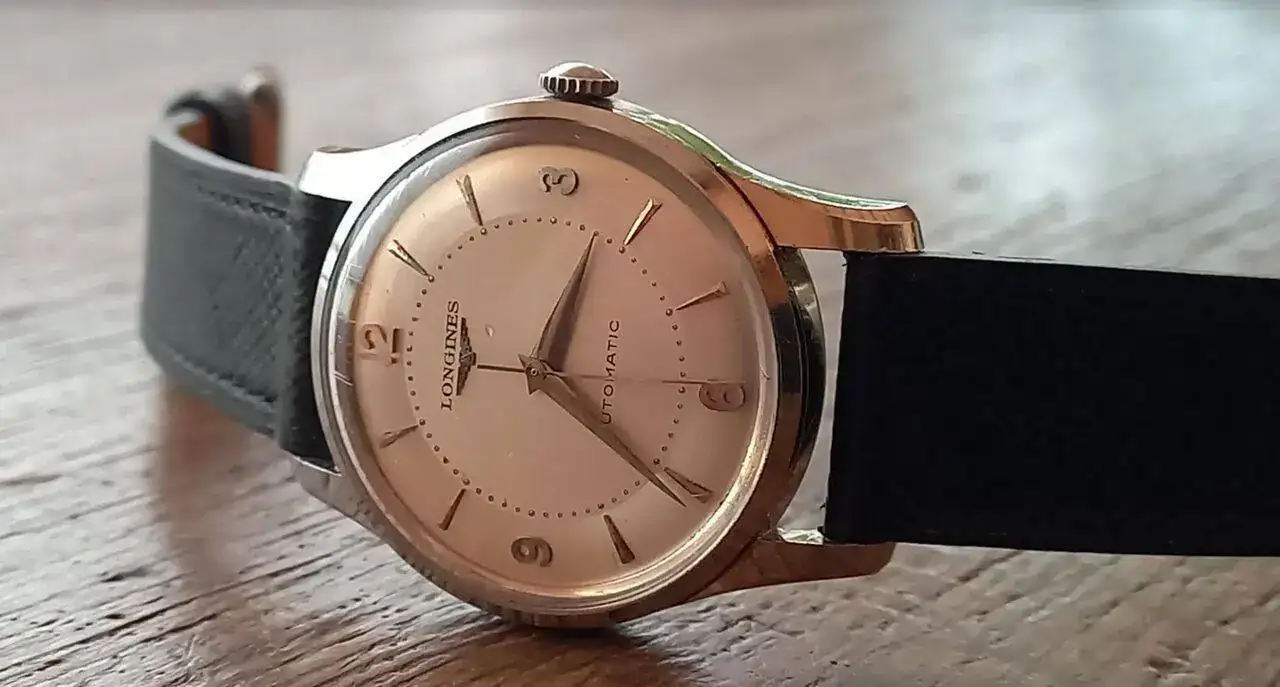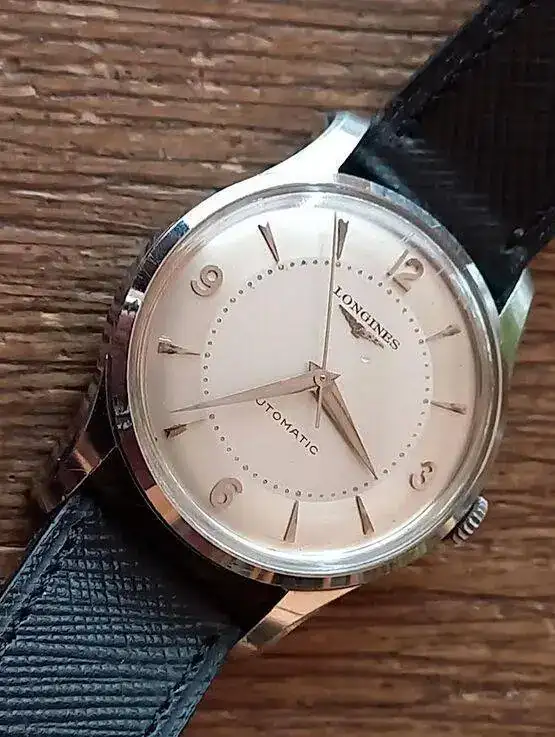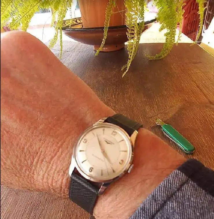 Hace tres meses entrado un nuevo Longines de 1952, tipico reloj en el estilo Calatrava. Lleva el primer movimiento automatico de la casa, tengo que decir, con rotor que gira 360 grados. Efectivamente no tengo conocimiento, que Longines tenia un automatico con el sistema de martillo. (#Abderramanll, la Reina Mora, sabe mas de esto automaticos con martillo)