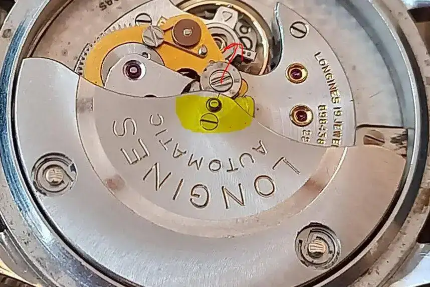 Diferente a otros automaticos que cargan sin parar, por esto tienen un muelle que salta una vuelta atras cuando esta al limite de carga, el calibre Longines desconecta el automatico para no romper el muelle. En la foto abajo se ve en amarillo un segmento que sube el grupo automatico para cargar el muelle (flecha). Cuando la resistencia es demasiado grande, una palanca desconecta el grupo automatico y el rotor. El muelle tiene un final como los movimientos de cuerda manual.