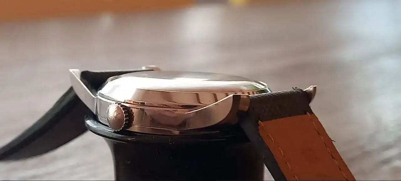 Miramos la caja de perfil vemos algo tipico de estos anos, es una caja de un reloj con movimiento de cuerda manual y para tener sitio por el calibre automatico el fondo esta muy profundo, como un plato de sopa. En la muneca se ve poco de esto y esta simulando tambien un reloj mas plano, un truco simple.
