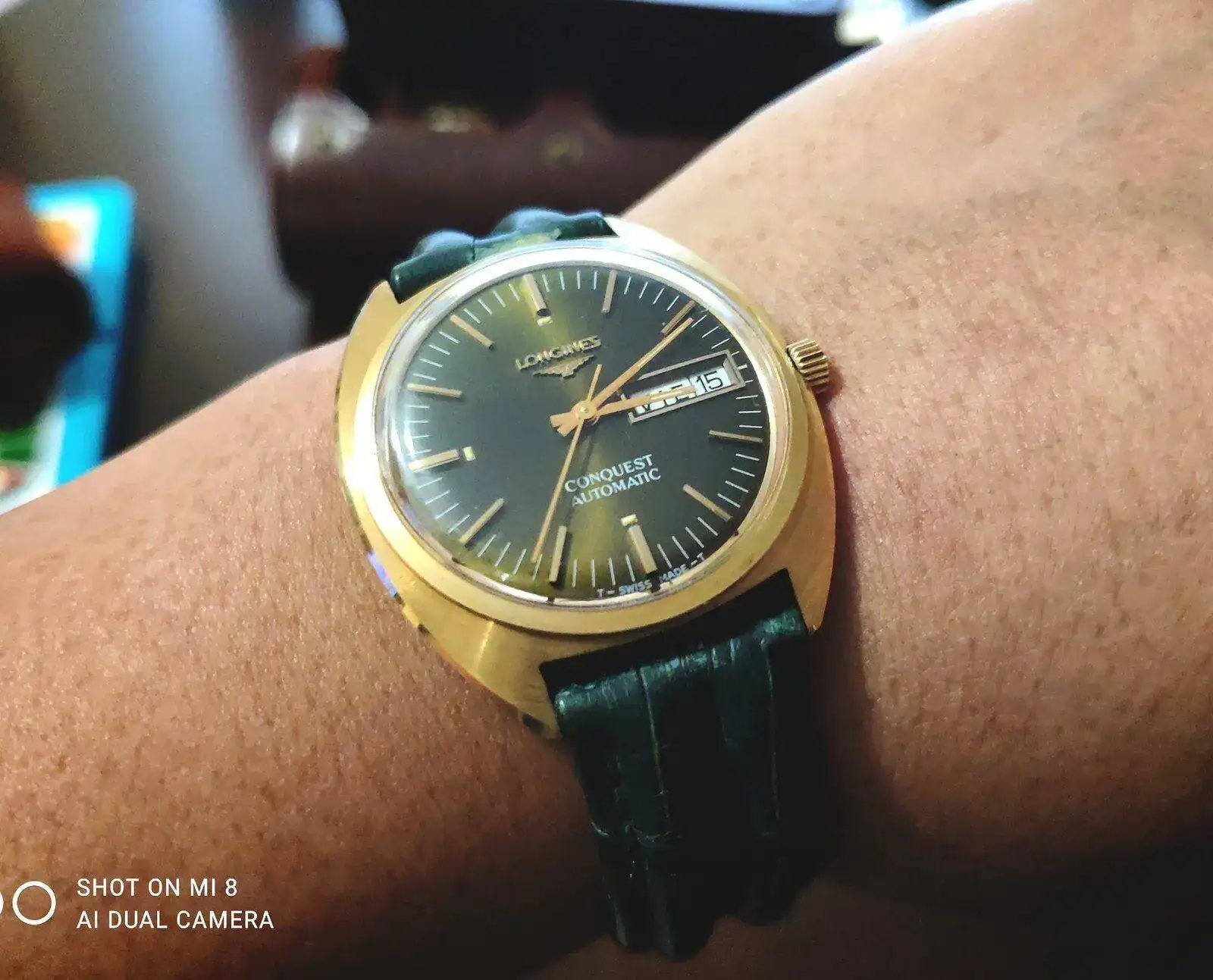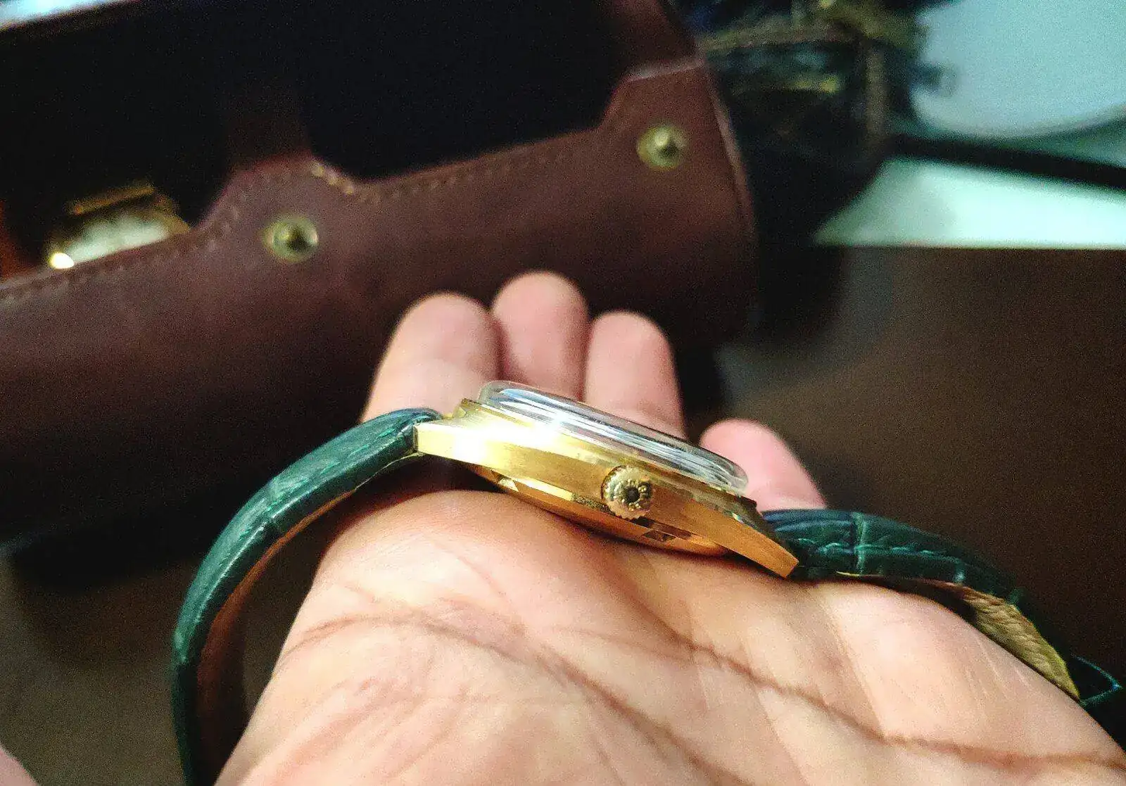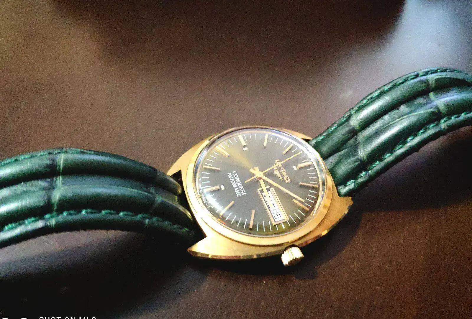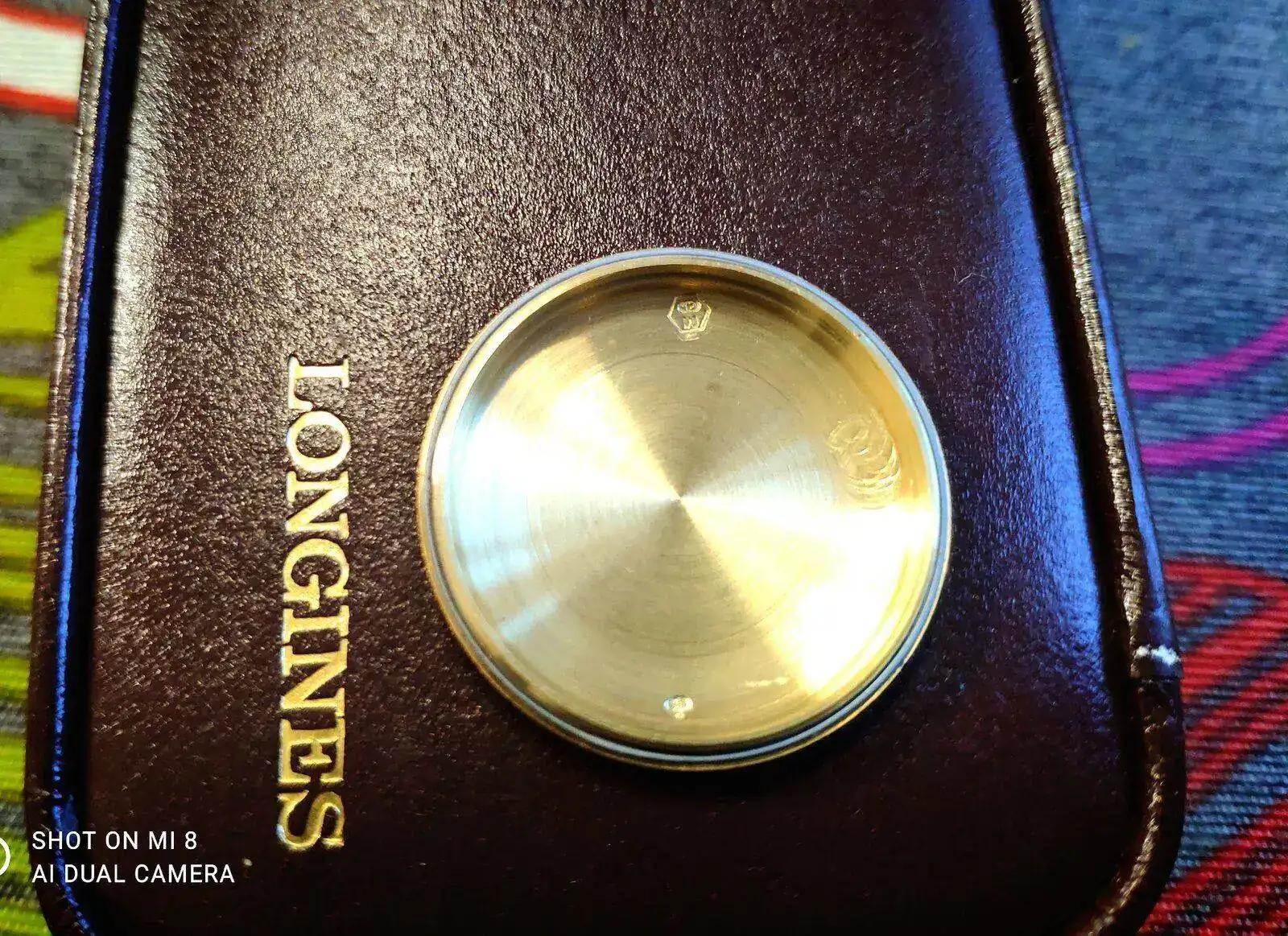 Los reyes llegaron tarde pero llegaron.... La verdad que lo compre para revenderlo, pero después de tenerlo en mis manos y jugar con él y la luz que refleja en el dial que se convierte en un verde esmeralda metalizado tan hermoso que no paro de contemplarlo, no creo que sea ese el color original, el tiempo ha echo el resto del trabajo, en cuanto llegue a casa, lo que hice fue abrirlo para mirar que movimiento llevaba un L636.1 y lo segundo mirar la tapa trasera que no lleva nada, creí que tendría una inscripción, pero no, solo un sello tal vez es de la empresa que lo realizó la fundición del oro y otra inscripción que se observa en las fotos en un pequeño hexágono las letras M c.h, al siguiente día visité una joyería de confianza para ver si en realidad era oro de 18kl y bueno efectivamente es oro 18 y ahora lo pondré en mi caja de relojes de mi colección privada.... Quería compartirlo que por más que buscó no encuentro otro igual ...bueno que sea de oro, en acero hay algunos pero solo con fecha y no día. Perdón por la calidad de las fotos están echa por mí móvil...de mi parte un feliz año a todos.
