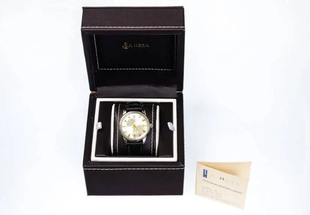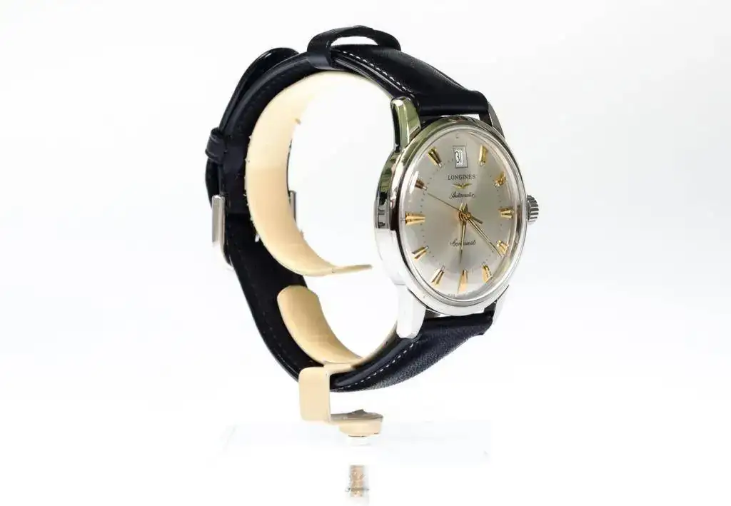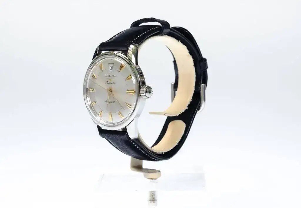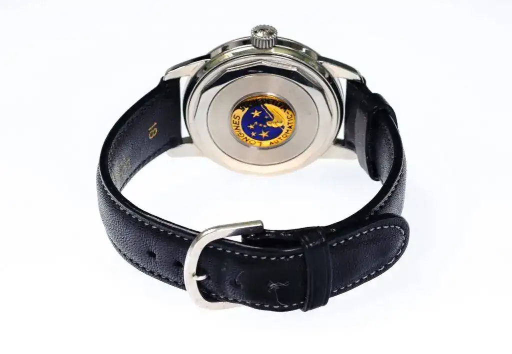 Año 1990. Movimiento automático que oscila a una frecuencia de 28.800 alternancias por hora, reserva de marcha de 38 horas. Caja en acero, diámetro de 35mm. Cristal de plexiglás, fondo atornillado. Esfera plateada con efecto “rayos de sol”, índices aplicados, agujas doradas. Hermético hasta 30m de profundidad. Correa de piel hebilla original Longines.