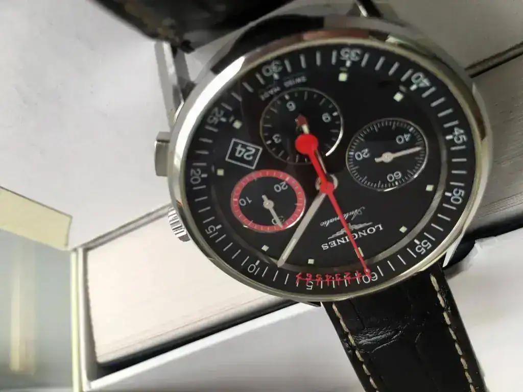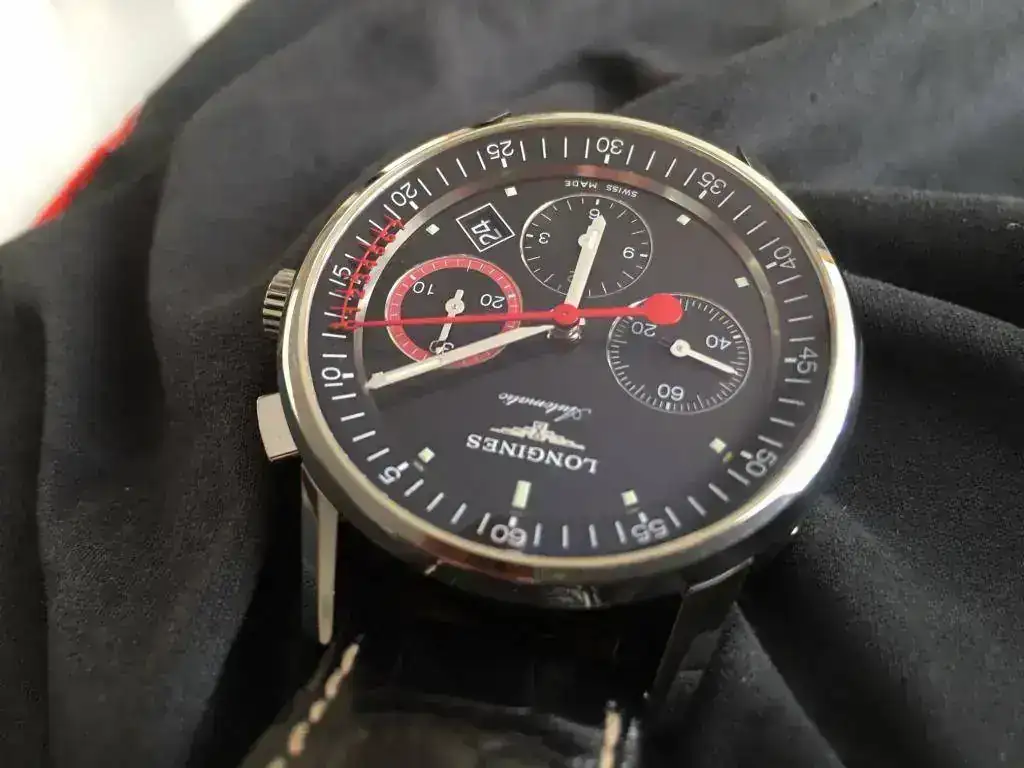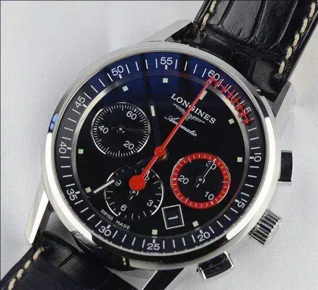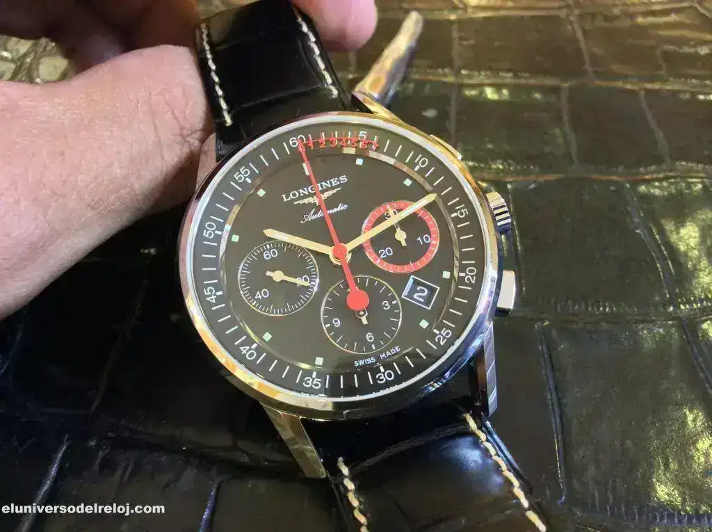 Un reloj de colección, el ultimo modelo de cronógrafo Longines con Escala Vernier. Esta peculiar forma de medir pequeñas fracciones de tiempo, la Escala de Vernier, va montada en la aguja de los segundos del Cronógrafo y puede medir hasta un octavo de segundo.