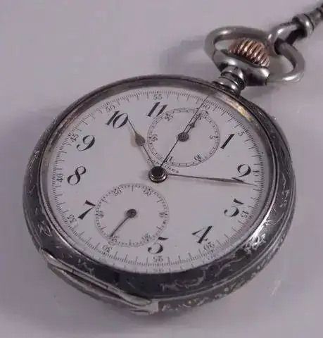 Reloj de bolsillo en plata. Simple, cronógrafo de patente Lugrin, con el movimiento del calibre 20H. El primer cronógrafo de Longines.[/FONT]