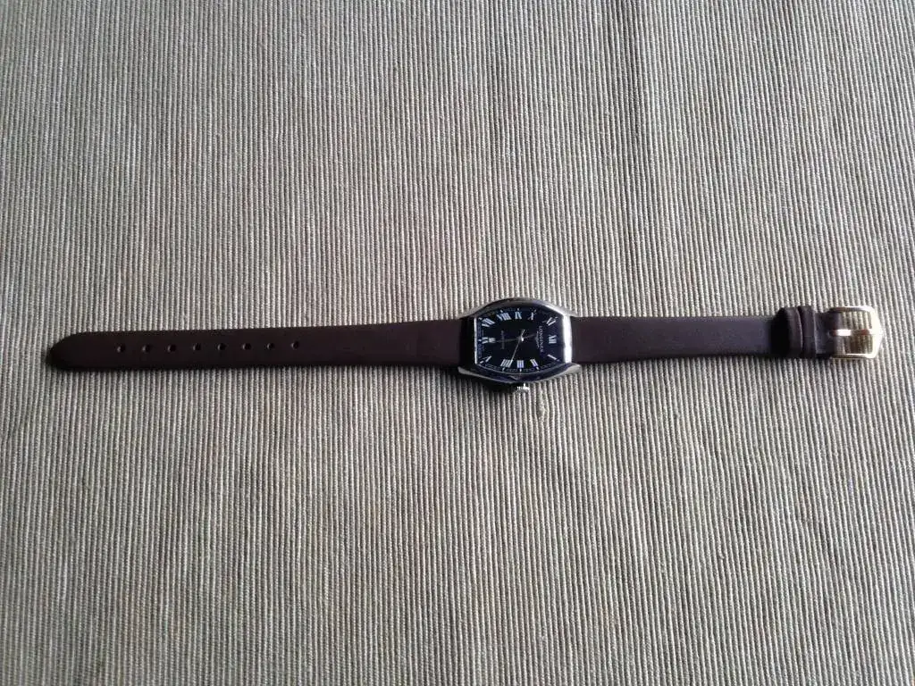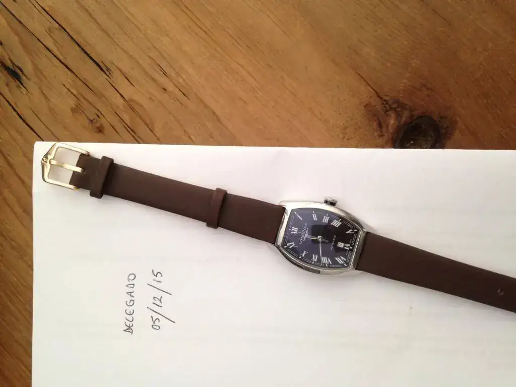 Le he puesto una correa marrón hirsch nueva que creo que le queda bien. La original de cocodrilo (con su broche desplegable) también la entrego. Tiene uso, aunque también vida por delante.
