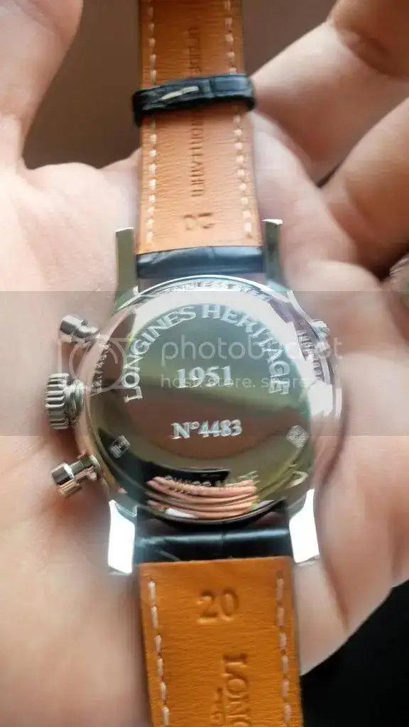 Aquí tenemos a nuestro amigo, el cronógrafo de la colección Heritage, modelo 1951, con un calibre Valjoux 7753 de 27 gemas, con una reserva de marcha de 48 horas. El reloj tiene un acabado en mi opinión muy bueno, muy brillante y por supuesto, con cristal de zafiro. La tapa trasera posee el grabado del modelo, el 1951, tampoco está muy esmerado, pero queda bastante elegante. La presentación en la caja es con una parte de imitación madera, dándole ese toque elegante que siempre busca Longines en sus relojes.