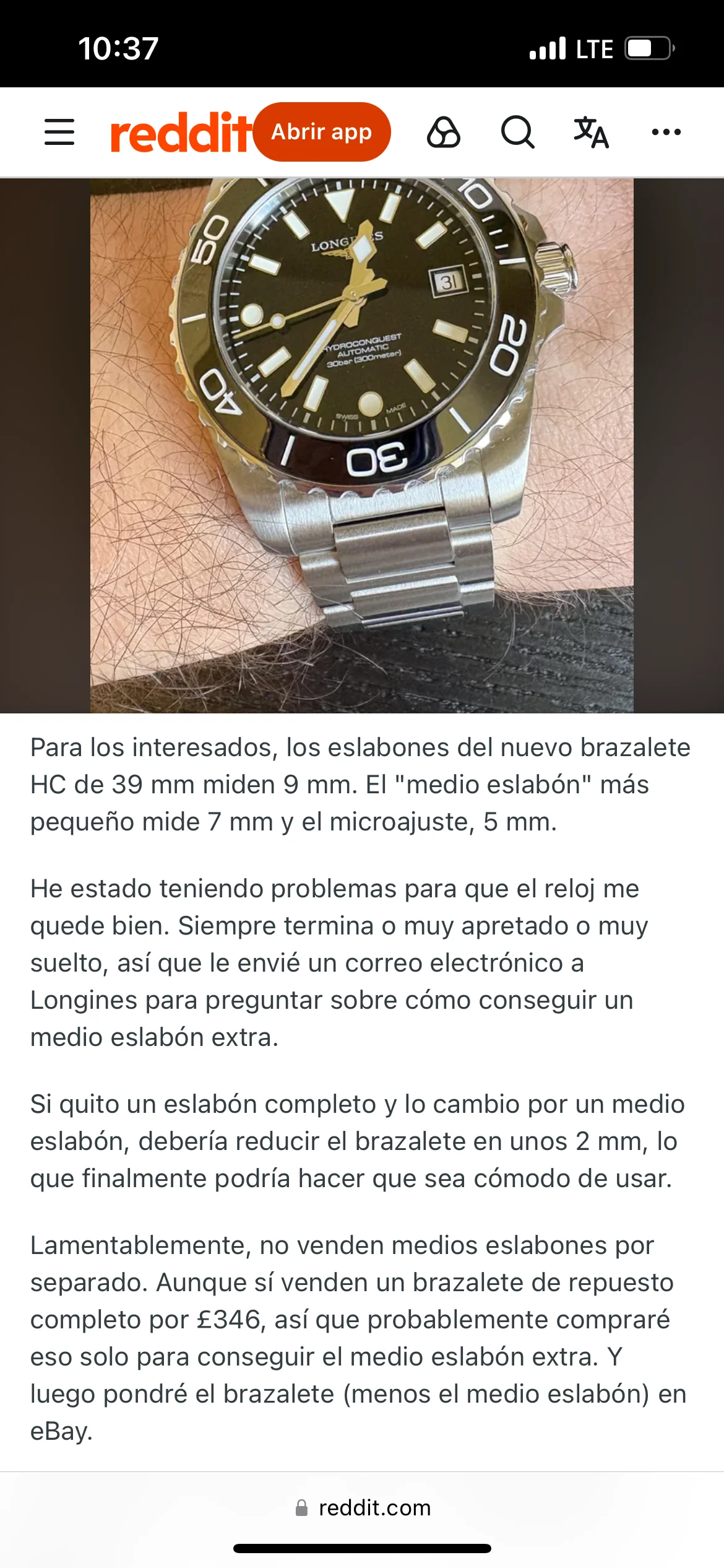 +1Supongo que "la solución" será de broma. Los eslabones los pueden conseguir en cualquier SAT de la marca, incluidos los medios. Y viniendo dos medios en cada brazalete y con 5mm de microajuste, hay que ser muy torpe (o muy pejigueras) para no conseguir que se te ajuste bien.
