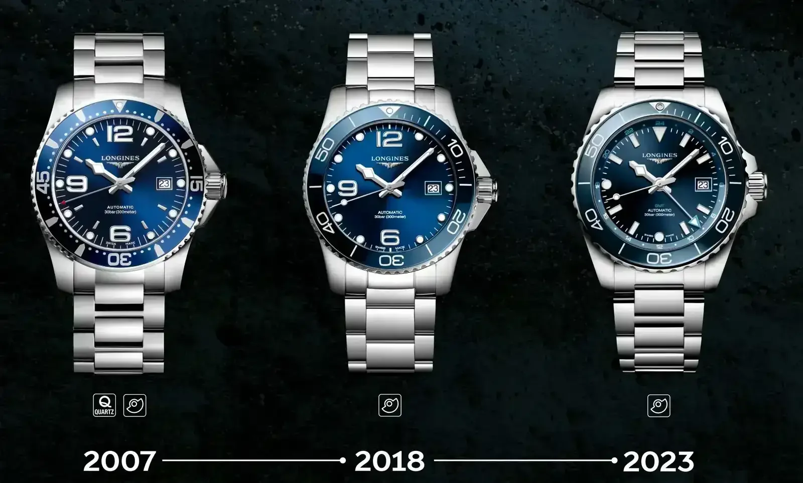 Hay dos versiones de Hydroconquest que no han incluido en la evolución: una, que diría que es anterior a los Hydros con bisel de aluminio y que convivió con ella, con dos únicos numerotes, esferas blanca o negra y bisel de acero; es probablemente la versión menos conocida del Hydro. Y otra, que sí que tuvo repercusión porque se anunció como sustituto del Hydro de numerotes, y que duró poco más de un año en el mercado: la que tiene todos los números (salvo el 3) en la esfera.
