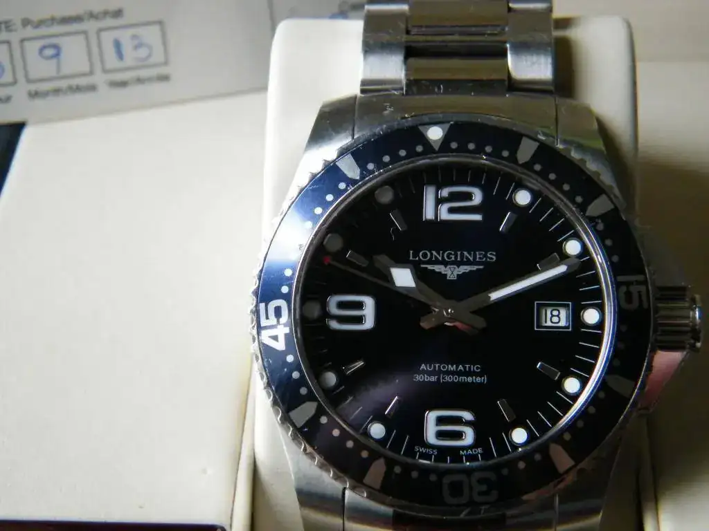 Saco este Hydroconquest automático sobradamente conocido en el foro. Se trata de un reloj usado con señales de uso normal como puede apreciarse en las imágenes. Se encuentra en perfectas condiciones y sigue ofreciendo satisfacciones a la muñeca que lo porte. Es la referencia L3.642.4 comprado por mí en 2013, completo con su caja y tarjeta de garantía, falta manual y caja de cartón.