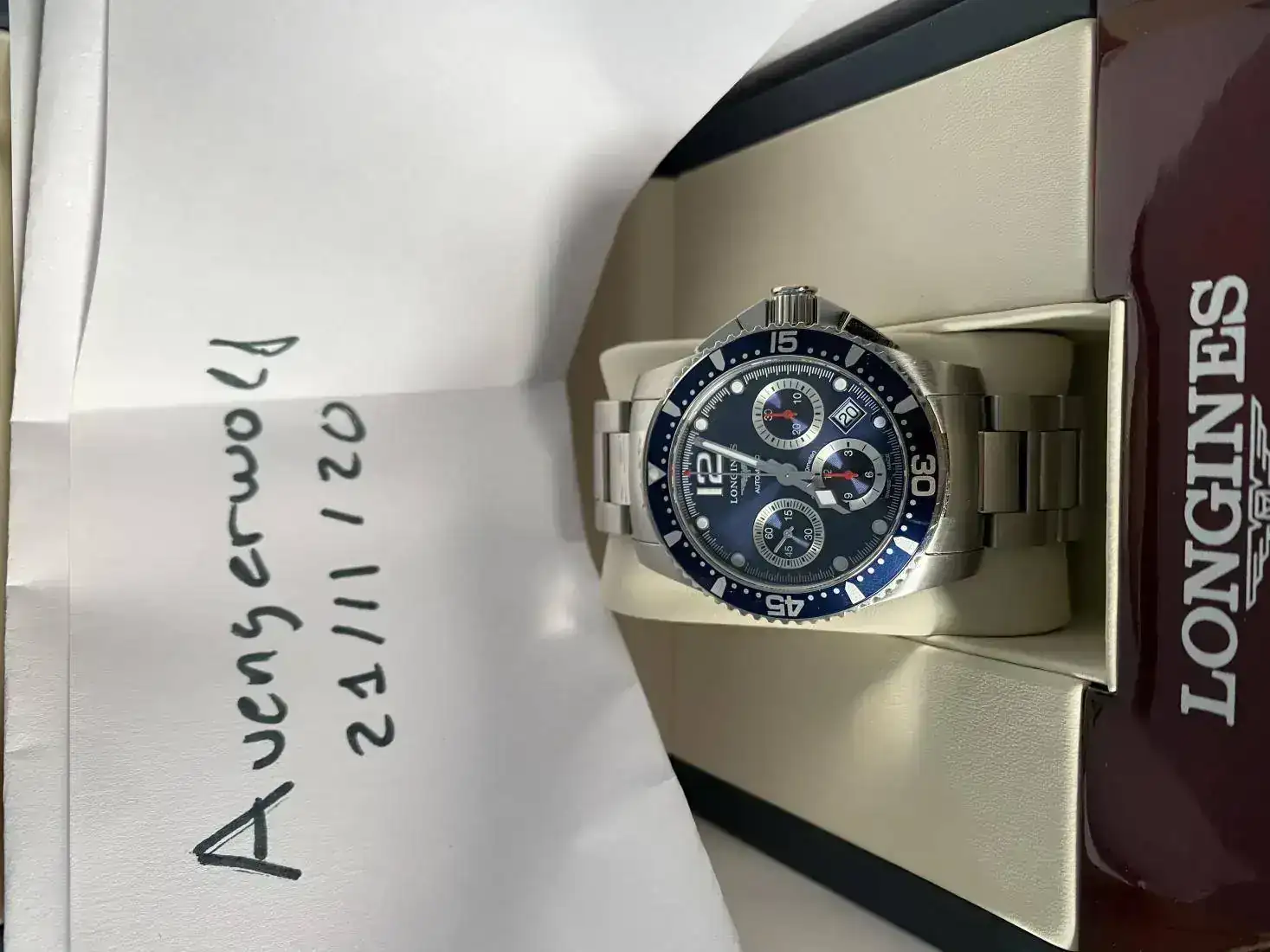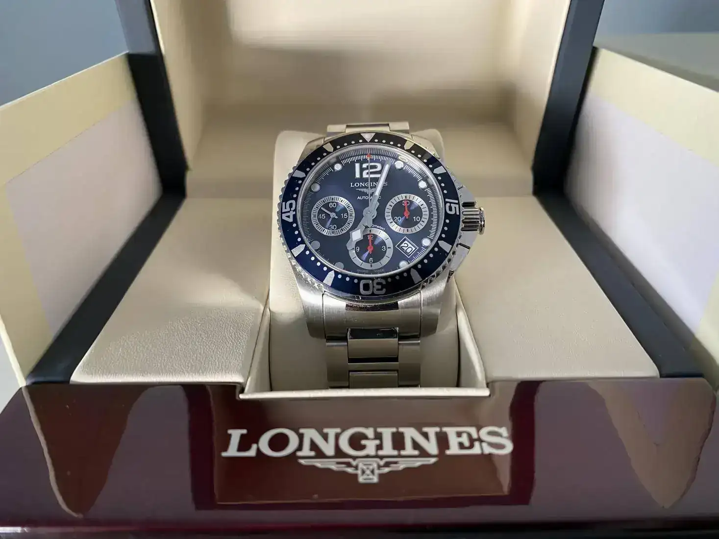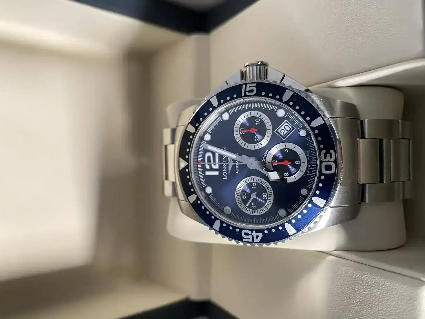 Sale a la venta este Longines Hydroconquest Chrono con esfera azul. Es un azul muy bonito que va cambiando según como le de la luz.