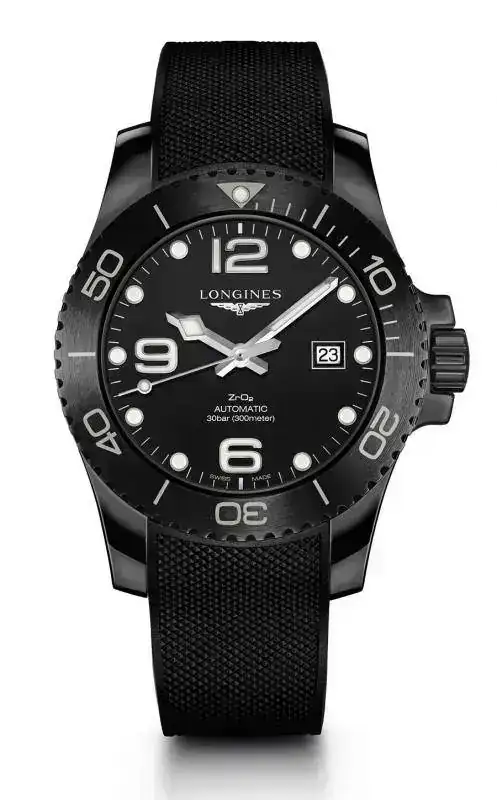 Estanco hasta 300 metros, bisel giratorio unidireccional, corona atornillada y hebilla desplegable con doble cierre de seguridad, el nuevo HydroConquest se presenta con una pulsera de caucho negro que ofrece la posibilidad de un ajuste preciso para una mayor comodidad.