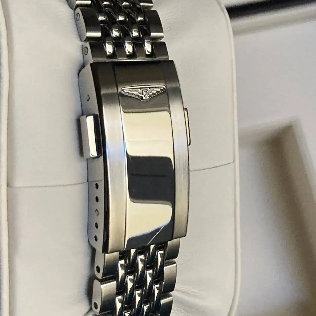 Me resulta un poco raro el encuentro de los endlinks cepillados en los laterales con las asas pulidas en la parte superior... aunque lo salva la presencia de los granos de arroz pulidos y el cepillado lateral de las asas. Cierre desplegable (no mariposa) con pulsadores laterales; sin microajuste rápido, pero con 5 posiciones de ajuste mediante pasador, y acabado cepillado en las calles laterales y pulido a espejo en el centro (imán para rayajos de desk-diving, está claro). El cierre se percibe sólido, bien ejecutado, y decorado con logo aplicado del reloj alado.