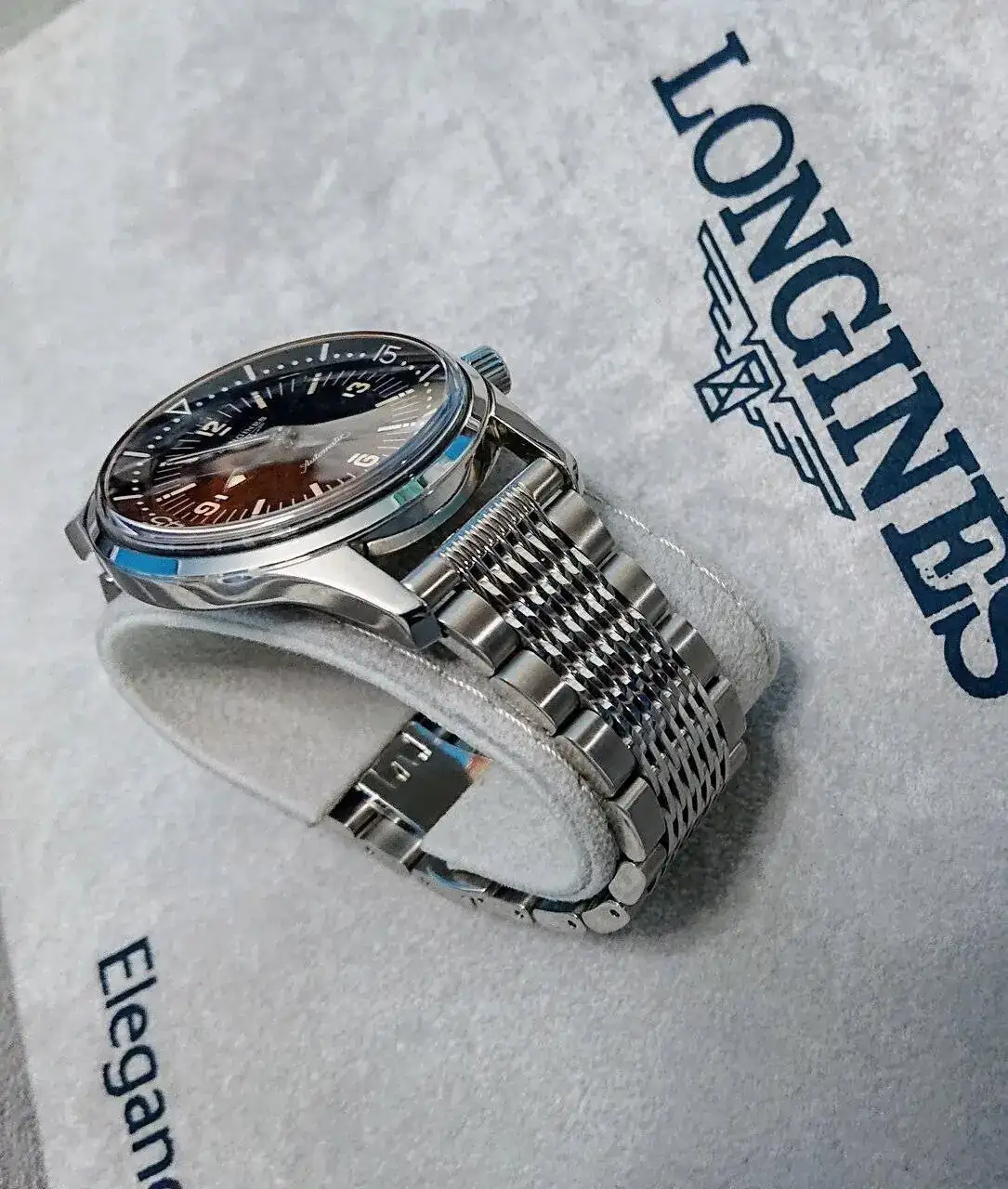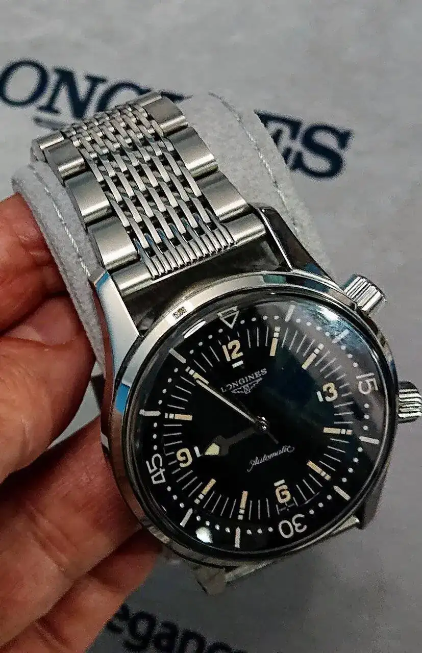 Sin embargo, en mi opinión, el Legend Diver se redondea con el brazalete granos de arroz. De hecho, a raíz de una publicación del compañero @jotape78descubrí que el brazalete del Rado Golden Horse 37mm era compatible con el LD36, y casualmente leí que el brazalete BOR de otro reloj que yo tenía, sin nada que ver con Longines ni el Grupo Swatch, encajaba bastante bien con la caja y asas del mío: el brazalete de un Dan Henry 1964