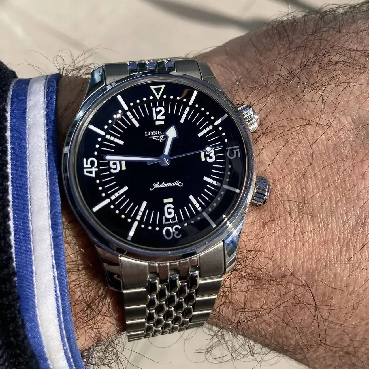 Una parte de mí (la clásica y tradicionalista) hubiese preferido que redimensionaran el 42mm a 38 ó 39 mm, manteniendo su estética, pulidos, esfera, y en todo caso añadir alguna de estas mejoras: calibre, brazalete, sin fecha... Sin embargo, resultado de la reinterpretación realizada, me parece que Longines ha obtenido un reloj muy acertado que sigue homenajeando el modelo original, y más fácil de llevar con un estilo más informal, más CUCO (más práctico también para mi, dado que se ha impuesto la vestimenta casual en mi oficina y cada vez uso menos el traje-corbata...). Estoy encantado, llevo varios días usándolo sin que me cueste esfuerzo repetir reloj (raro en mí, que necesito cambiar de reloj a veces incluso a lo largo del día), y lo encuentro muy cómodo, muy legible, preciso, equilibrado y bello... Entra en el grupo de favoritos de mi colección, se queda como el Legend Diver que debo tener.