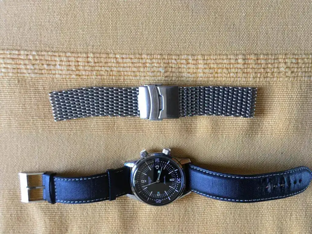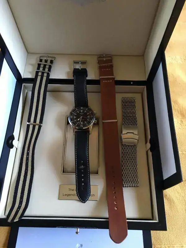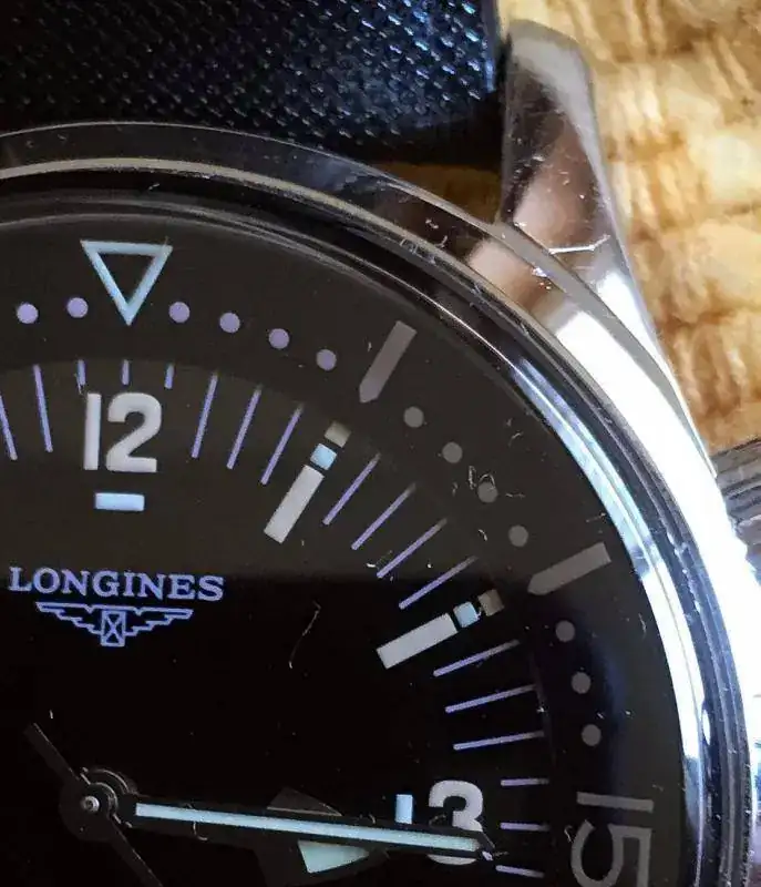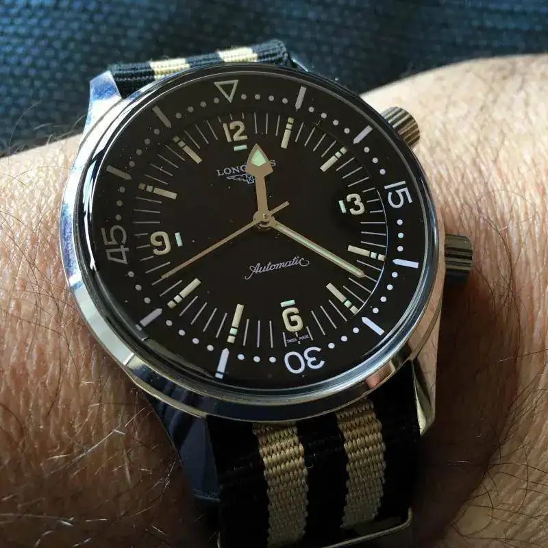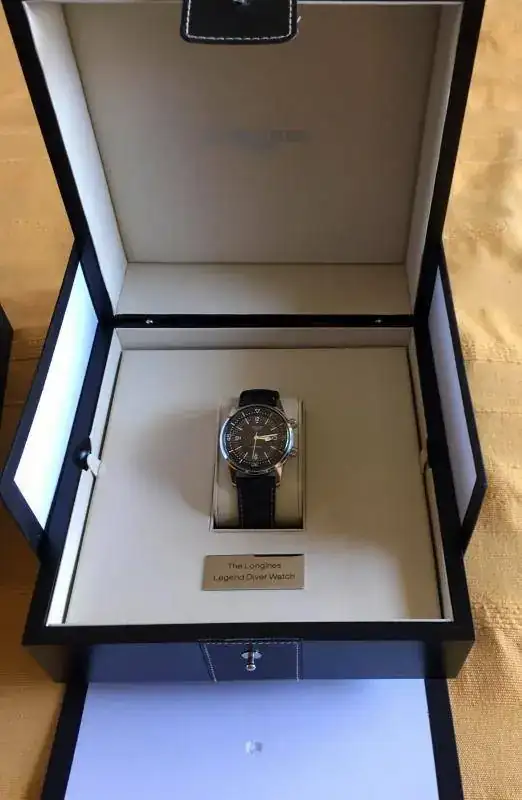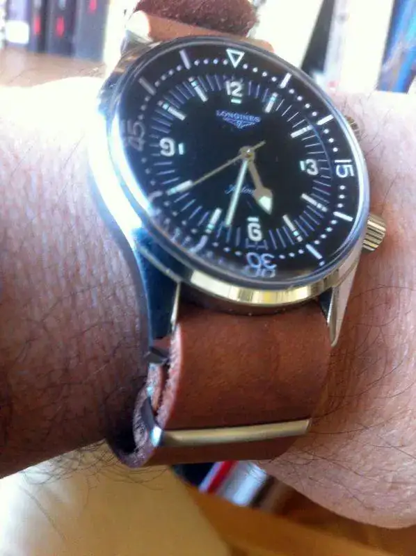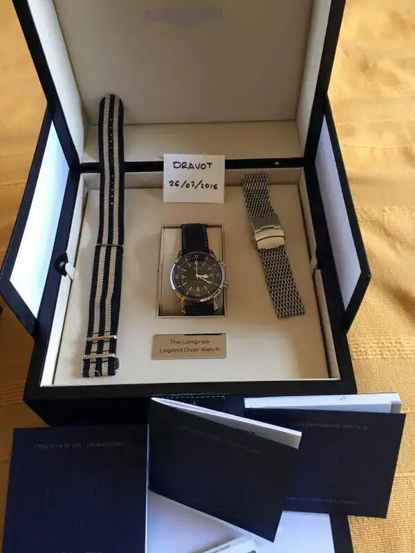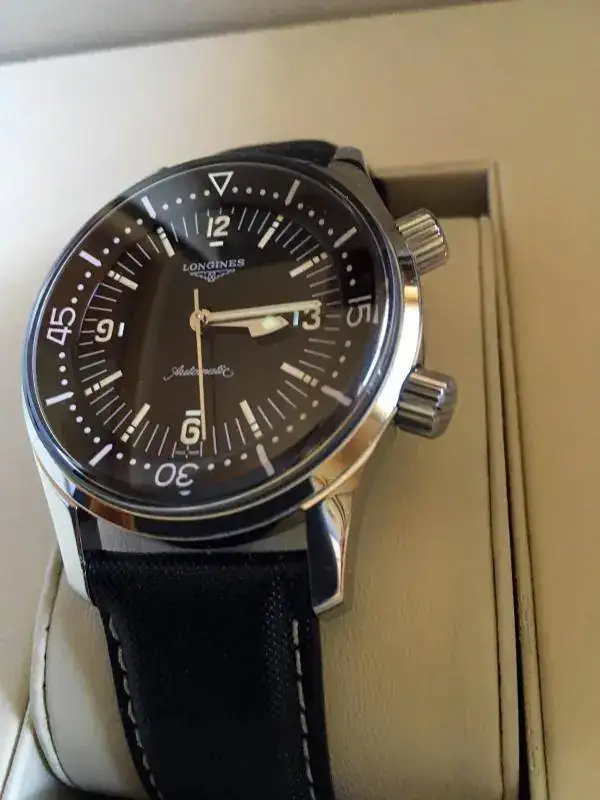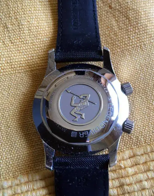 Hola, pongo a la venta mi Longines Legend Diver sin fechador. El reloj ha tenido uso, pero está bien cuidado. Presenta los típicos pelillos, con uno un poco más visible, que he intentado sacar en la foto, en asa superior derecha. Tiene la correa original con su buckle, aunque está en mal estado. Cuando la compré no era nueva, pero no estaba mal; al principio me la pondría dos veces, no más, y la guardé. Al recuperarla estaba como cuarteada. Es una correa muy bonita y que al Legend no le queda mal, pero de calidad deja bastante que desear. En compensación, el reloj va, además, con una milanesa genérica que le queda muy bien, y dos natos: la típica del Legend, ocre y negra, y una artesanal de cuero (pongo fotos de archivo algo malas).