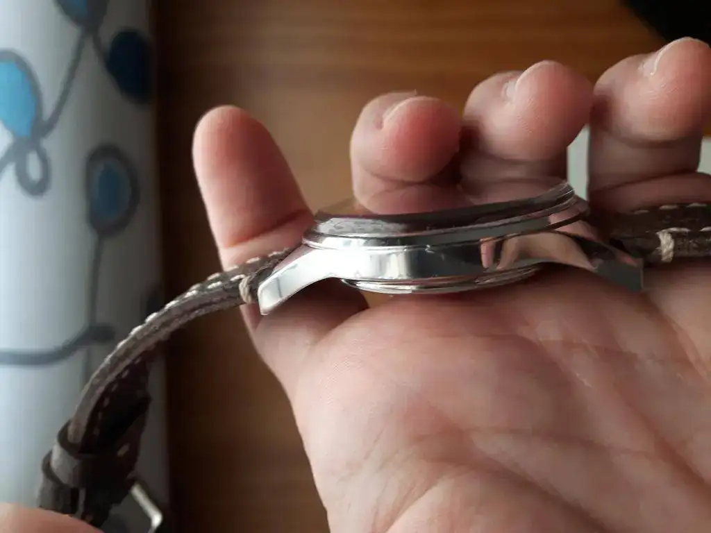 .Su estado es bueno , tiene pelillos en las asas del cambio de correa y alguno en la caja pero nada grabe el mas visible es uno en la caja entre las 5 y las 6 pero eso un pelo, quiero destacar todo para que no haya problemas , el reloj esta completo de todo caja ,tarjeta, todo el set.