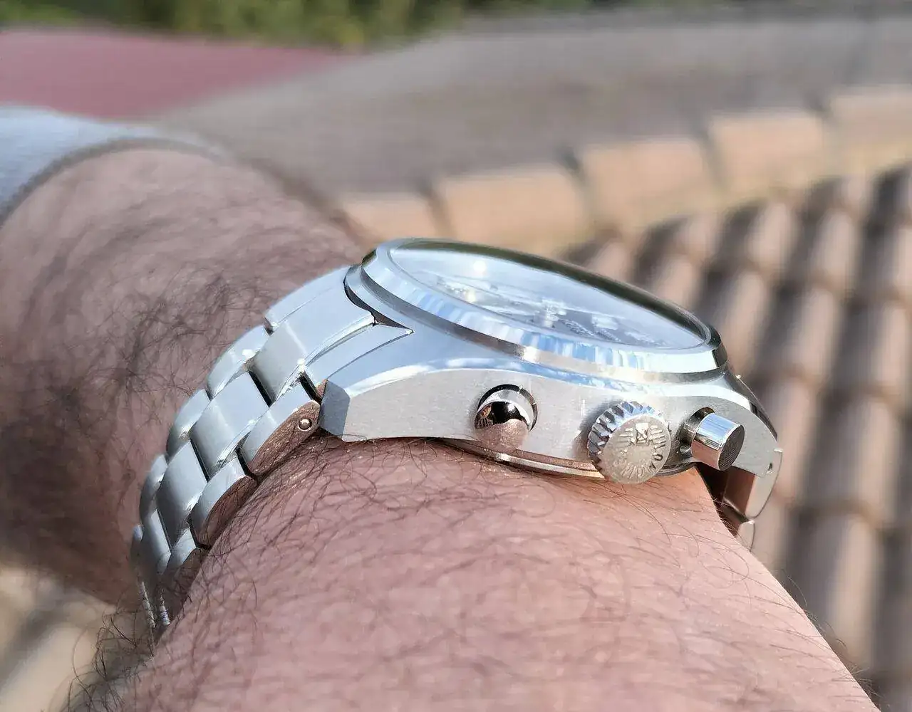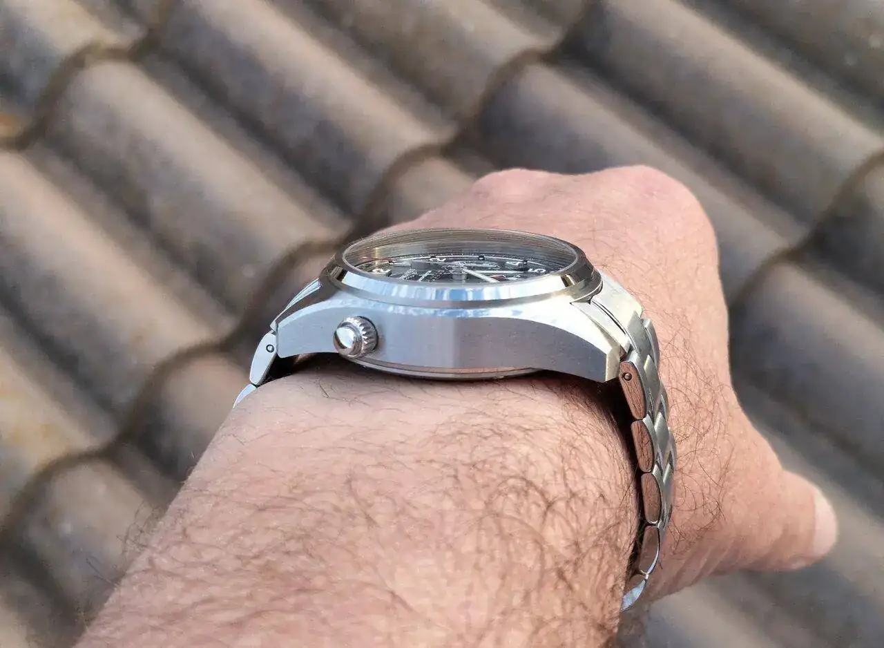 En fin, el reloj es el que es por dimensiones. Quiero decir que no es para todas las muñecas. Es grande y alto, poco más que un Citizen Kraken o un Aquaracer Calibre 16 que tengo, pero parece menos. Pienso que los botones y corona están muy acordes con el tamaño del reloj y veo curioso el botón roscado para el ajuste de fecha a las 10. No me estorba.