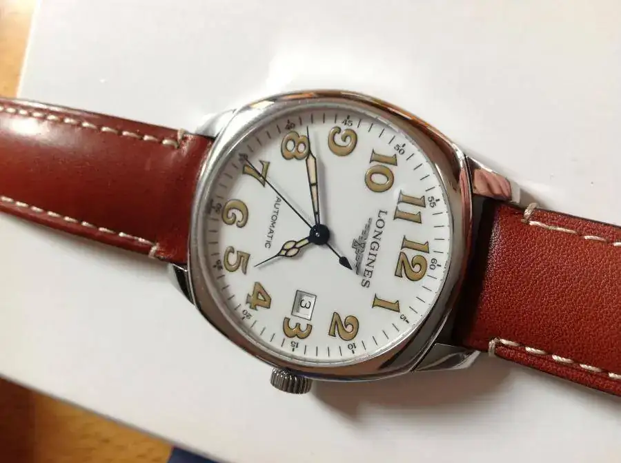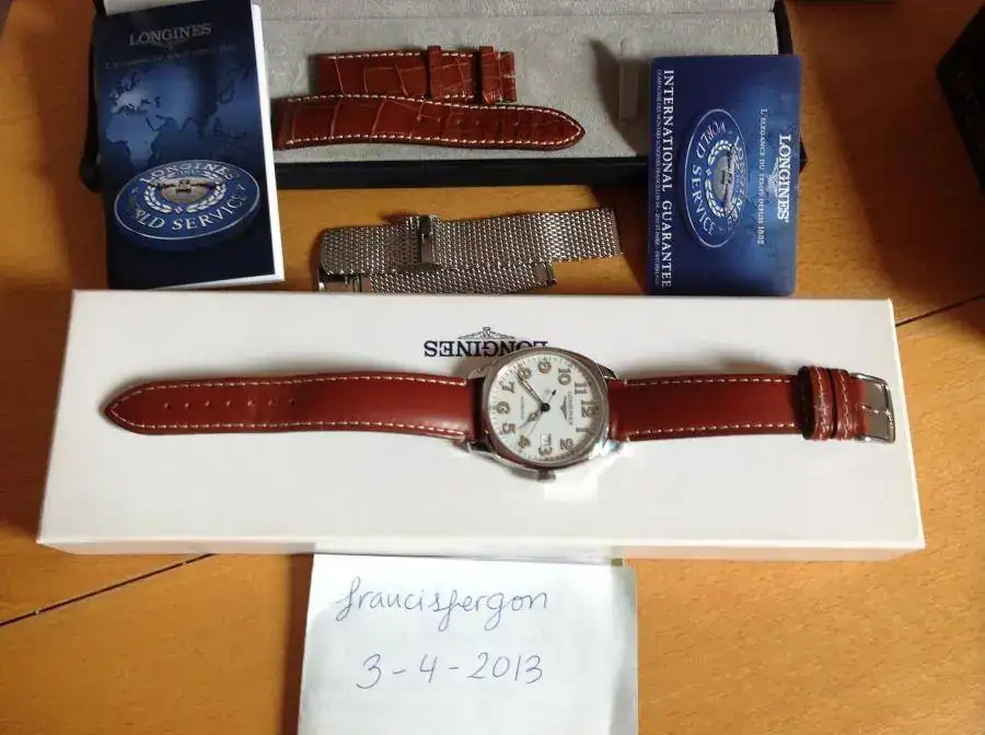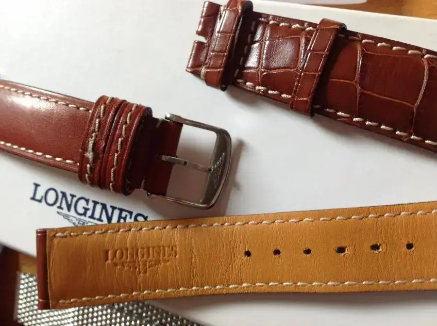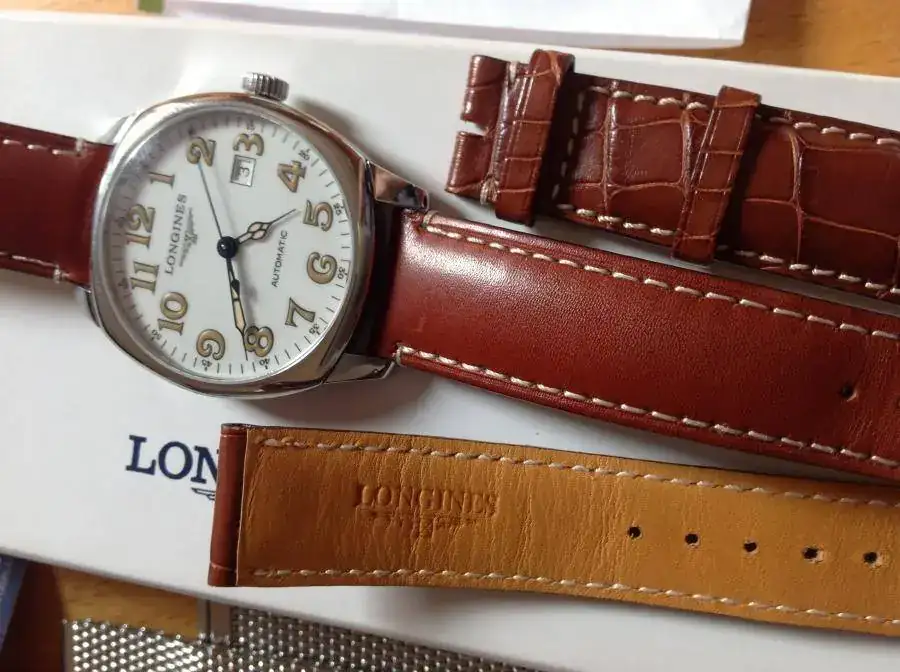 va con su correa original de cocodrilo con una sola puesta, otra de piel genérica, con la que lo he usado las pocas veces que he usado el reloj, e incluyo una milanesa que le da un aspecto retro muy bonito.