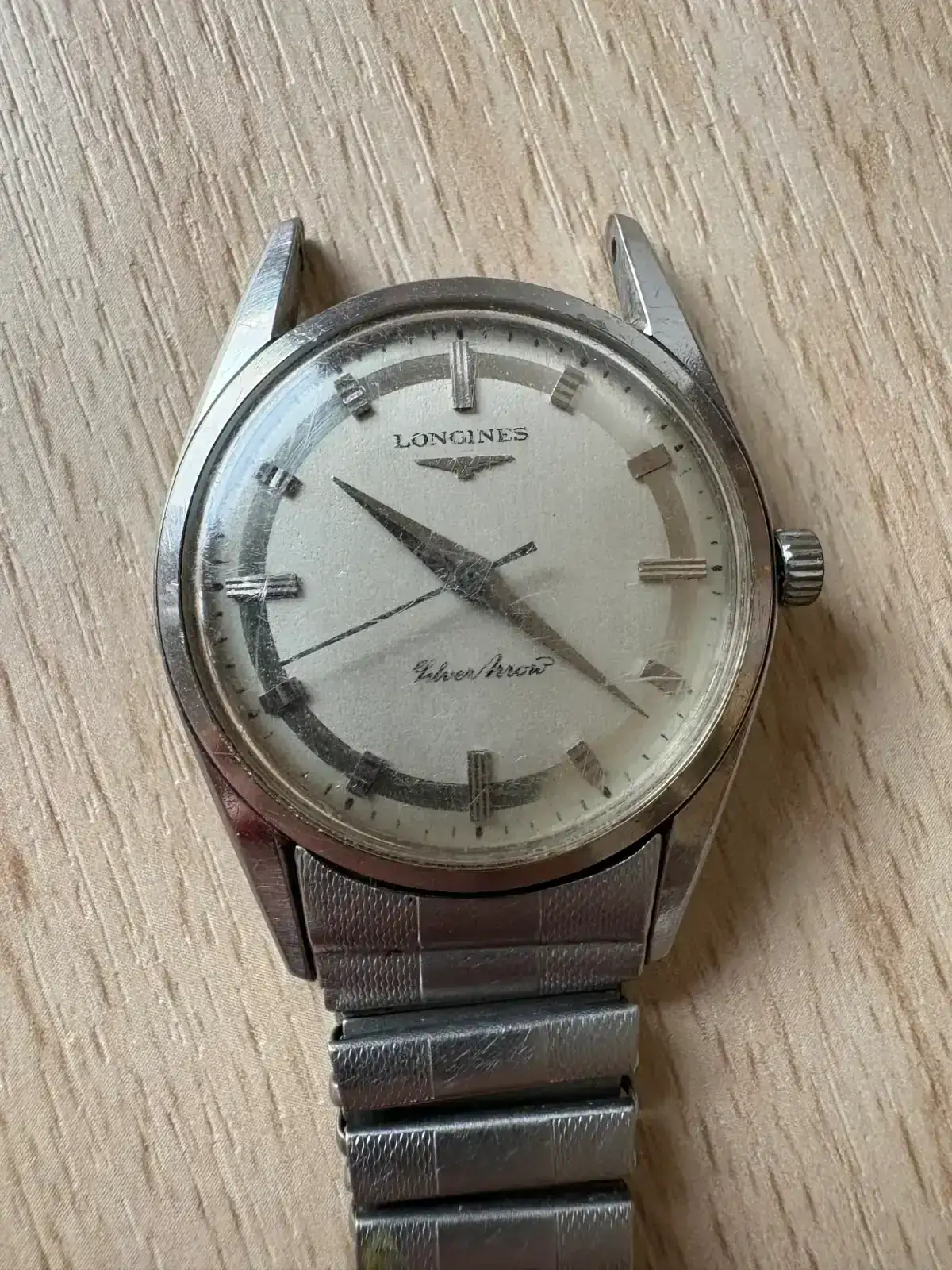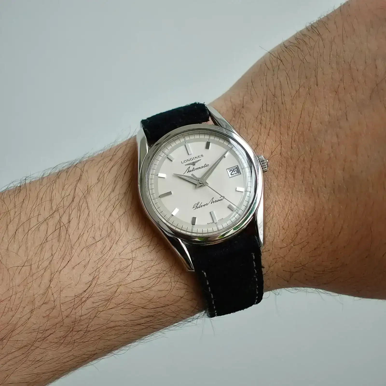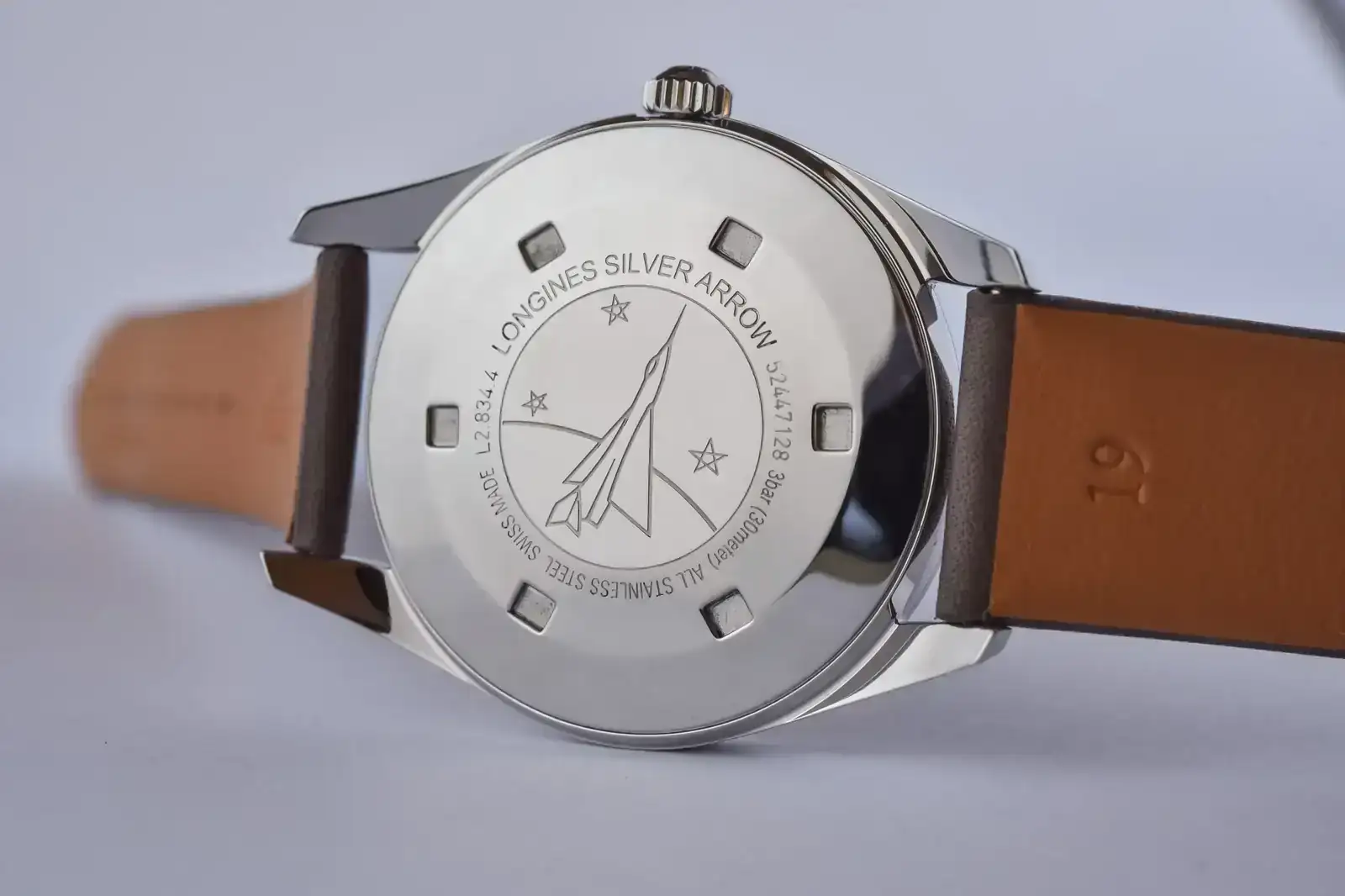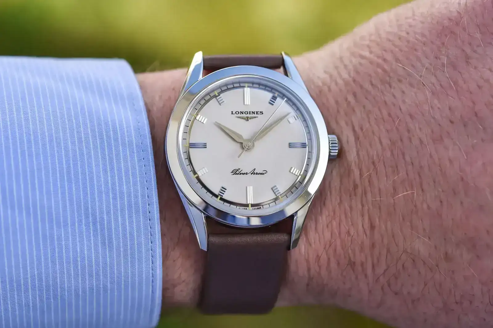 Stirling Moss y el cinco veces campeón mundial de Fórmula 1, Juan Manuel Fangio, en 1955 disfrutaban quemando gasolina al volante de un Mercedes. Cuentan las malas lenguas que Longines quiso hacerles un guiño y que, entre innumerables nombres posibles, decidió llamar a su nueva creación Silver Arrow (Flecha Plateada), en honor al Mercedes que pilotaban estos y sus prefecesores en aquellos tiempos.