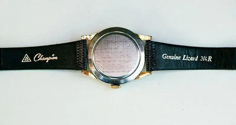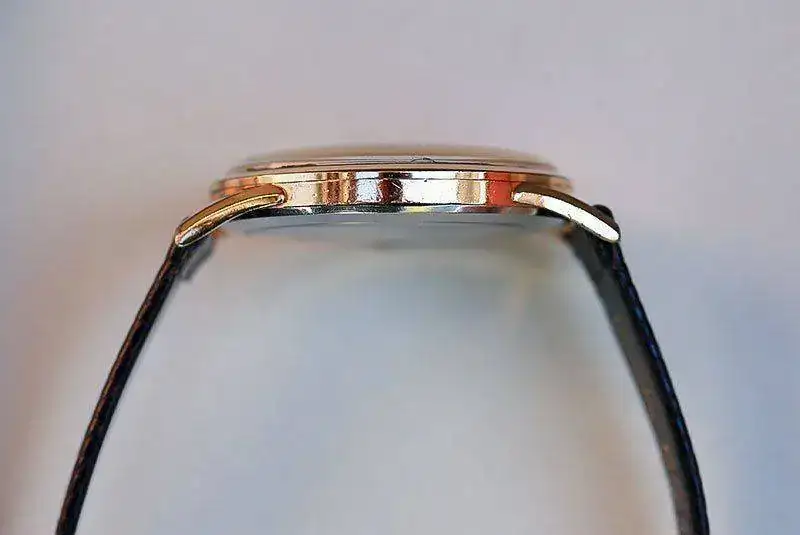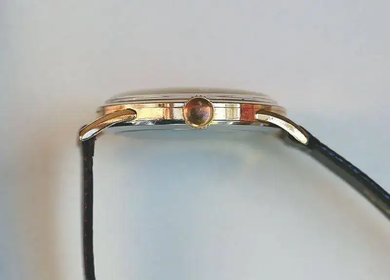 Caja bañada en oro de 18K 20 micras, de diámetro 37mm sin contar corona, un tamaño generoso para lo que se llevaba en la época. Corona en baño de oro sin firmar. Tapa del fondo caja en acero inox. con leyenda en el reverso. Cristal original plexi abombado muy claro sin rayas ni marcas aparentes. En 2015 realizado por relojero profesional un suave pulido del mismo.