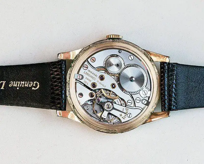 Maquinaria fabricada por Longines en un estado realmente bueno con el muy reputado calibre 30L que lleva 17 rubíes. Movimiento mecánico de carga manual. Su tic-tac es sonoro y una gozada escucharlo.