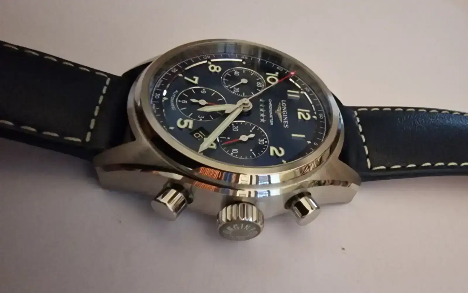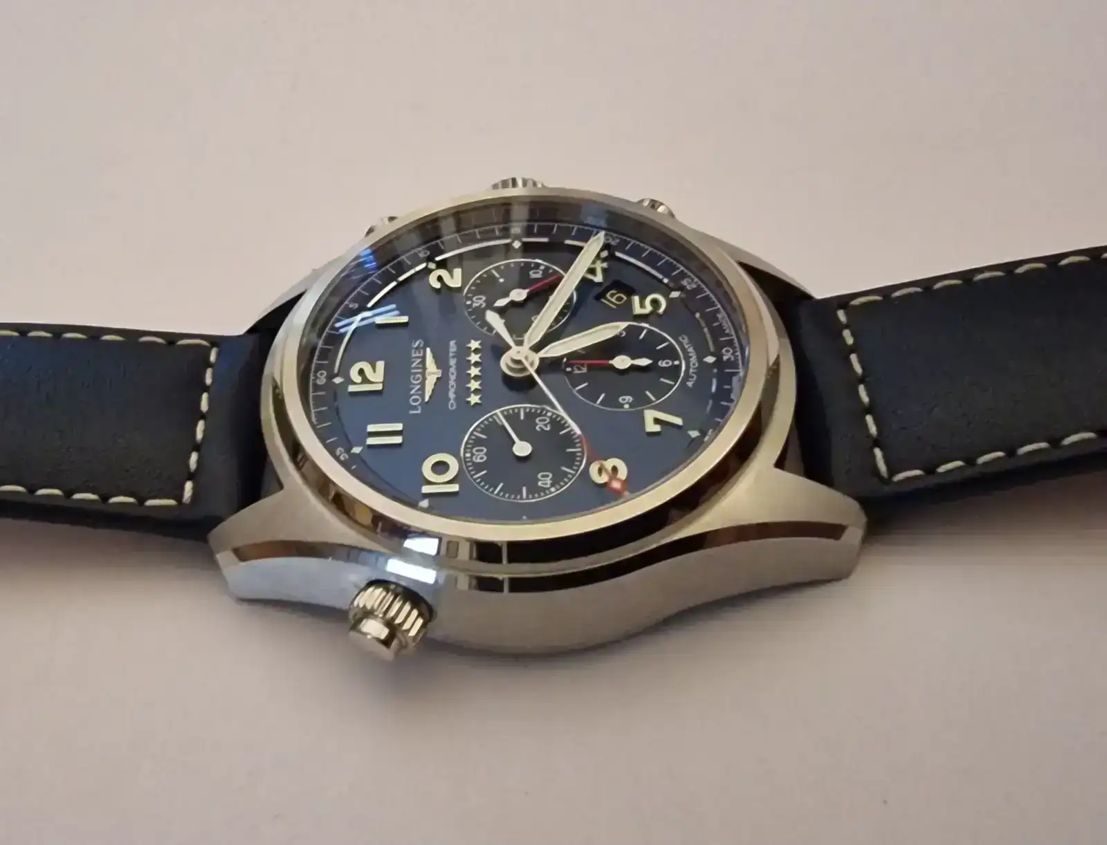 Como ya adelanté en mi reciente presentación del Tag Heuer, se Trata del Longines, en este caso Spirit L3.820.4.93.0, modelo que viene con certificación COSC. Es de 42mm que es la medida que mas me gusta aunque mi muñeca no es muy ancha (17,5cm). Corona roscable y pulsadodor a la izda. de cambio de fecha tambien roscable. Con una resistencia al agua de 10 atm (100mt) Y cronografo.