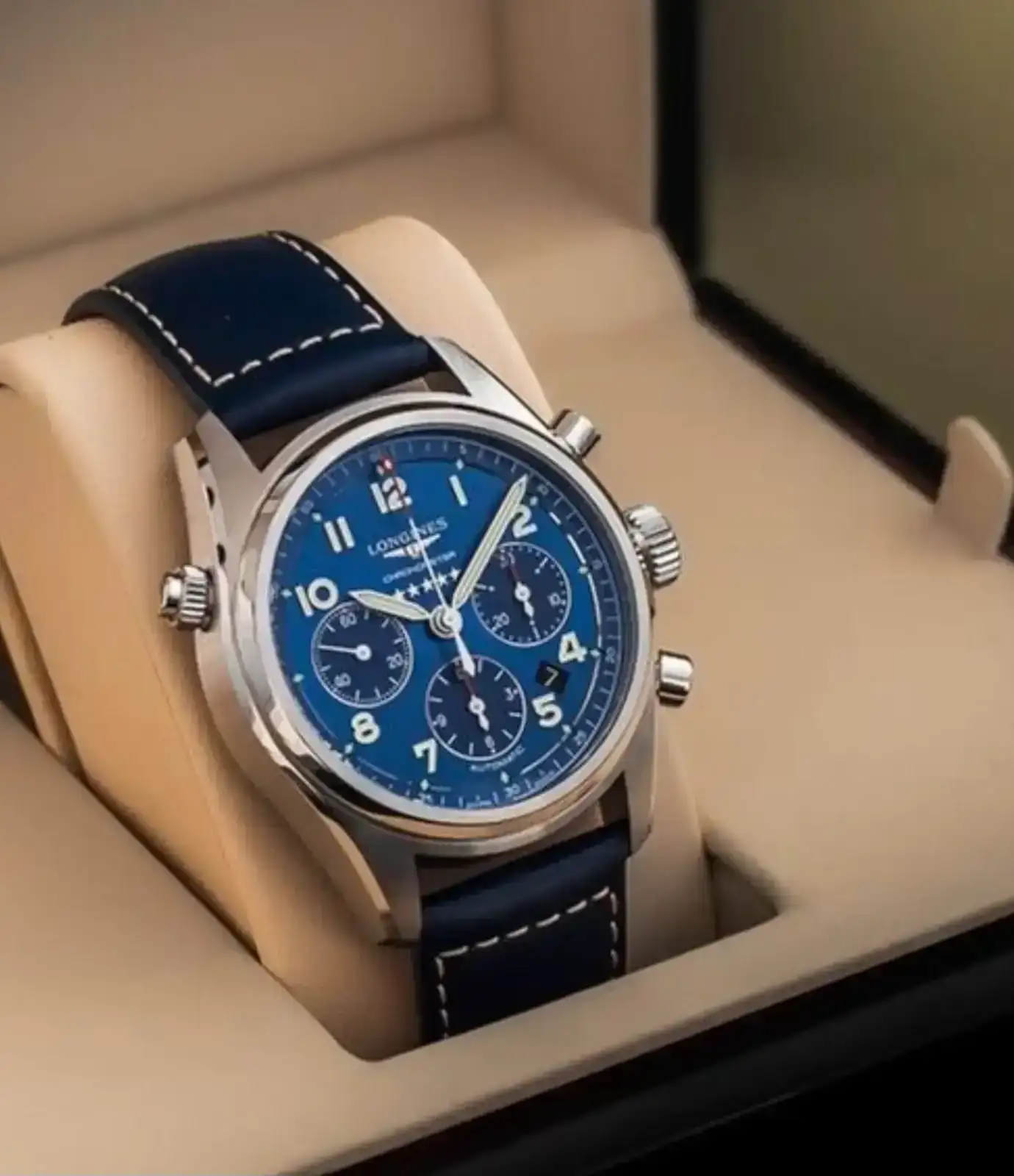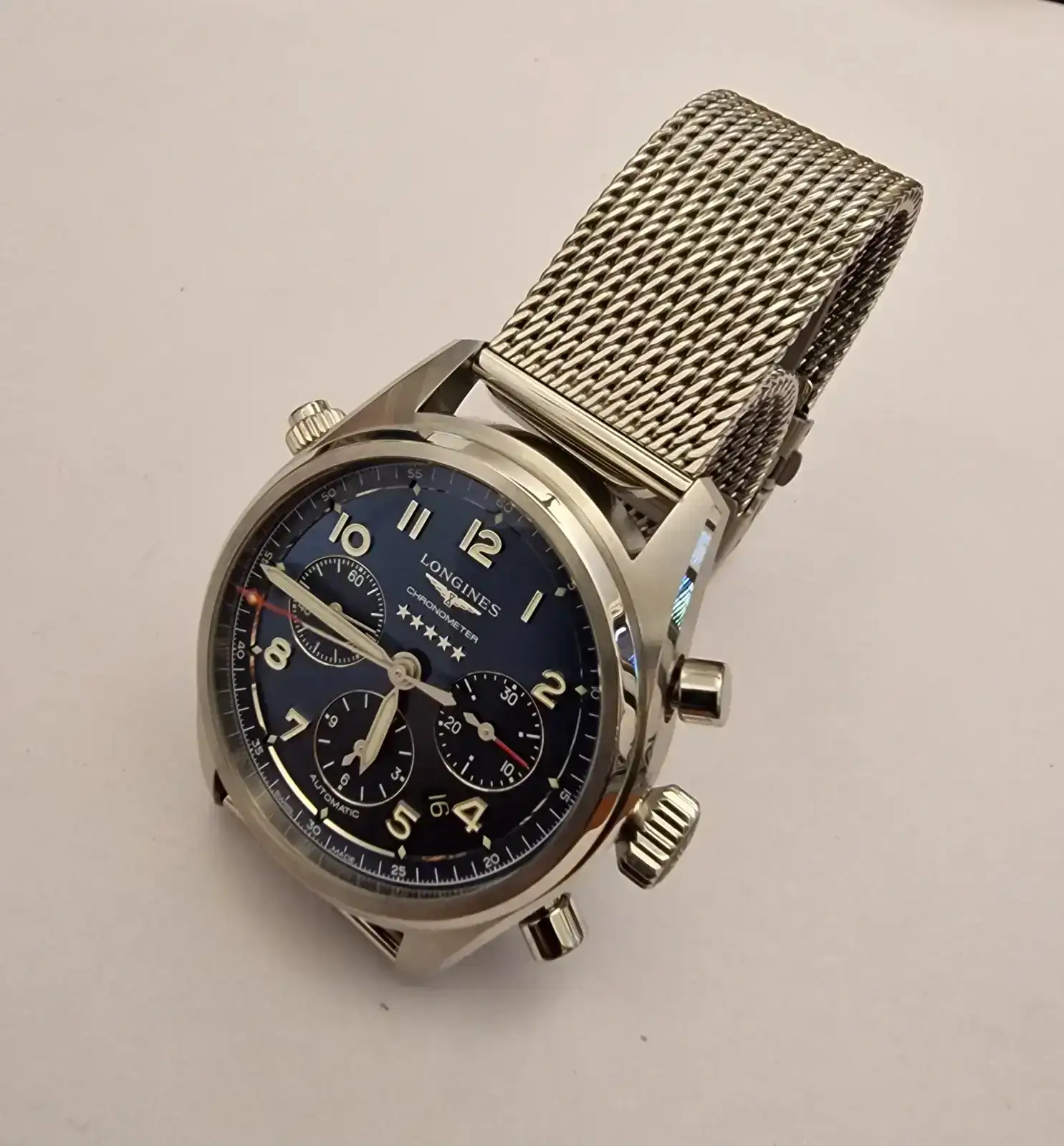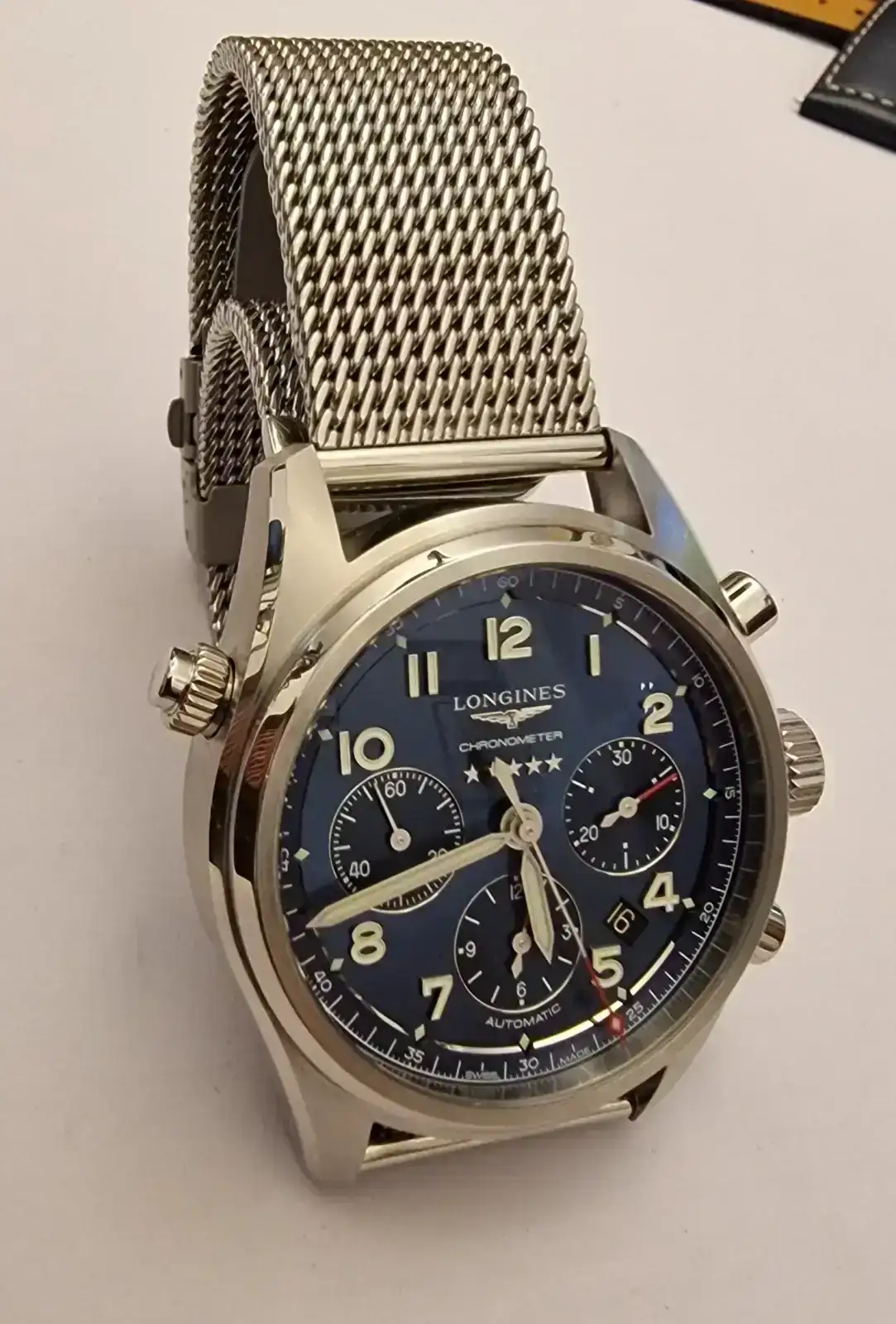 Viene con correa de piel tambien azul, pero a la par del Tag Heuer le pedí una milanesa (la del Tag de 20mm y la del Longines de 22mm), que últimamente me gustan mucho como quedan en cualquier reloj, como variantes periódicas, mas en este caso que al ser de piel la original, en verano ya se sabe que no es lo mas adecuado. Pero una vez probada y vista la milanesa en este reloj, puedo asegurar que muy dificilmente lo vuelva a ver con la original de cuero. Vamos! es que le queda como PAC 👌