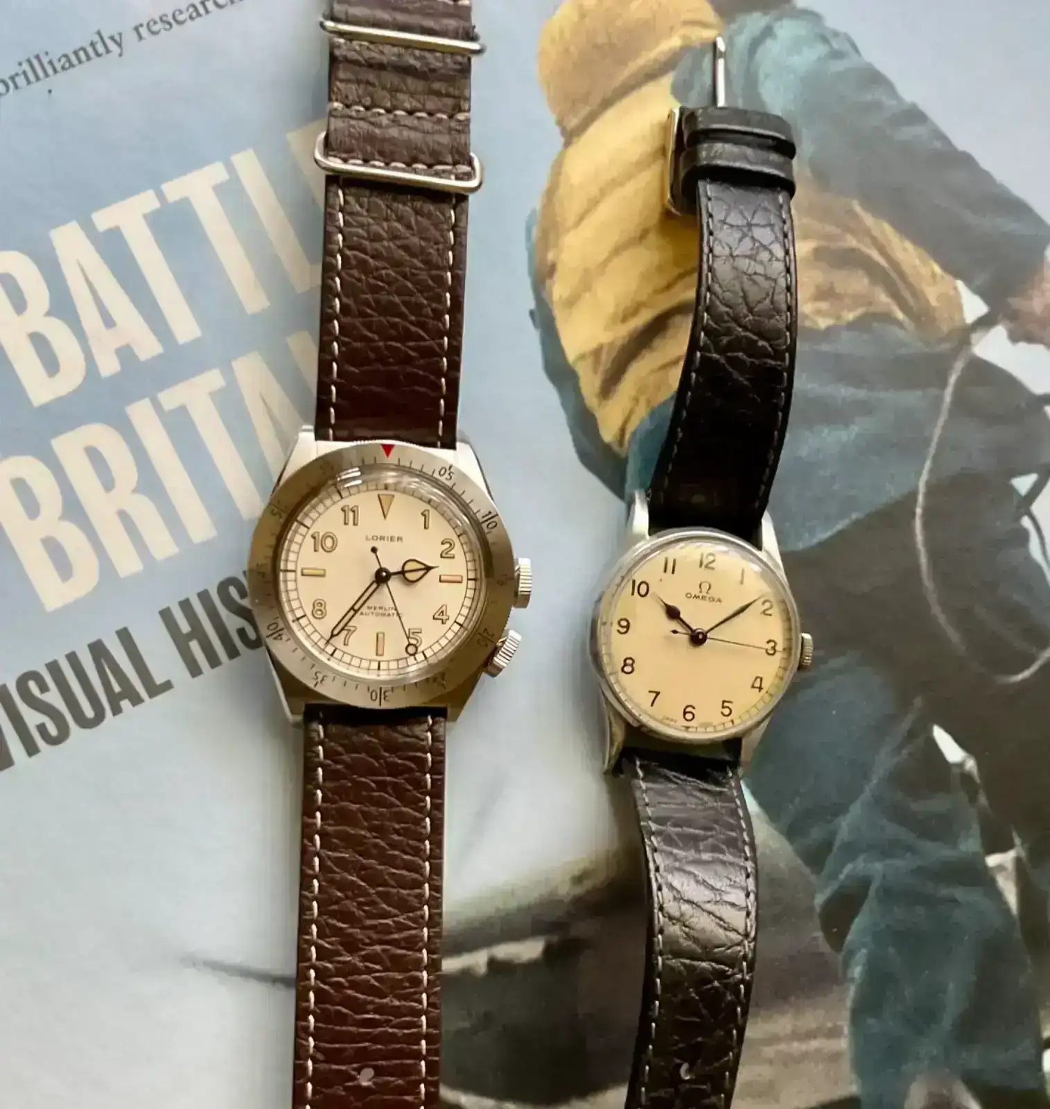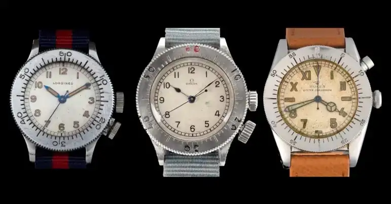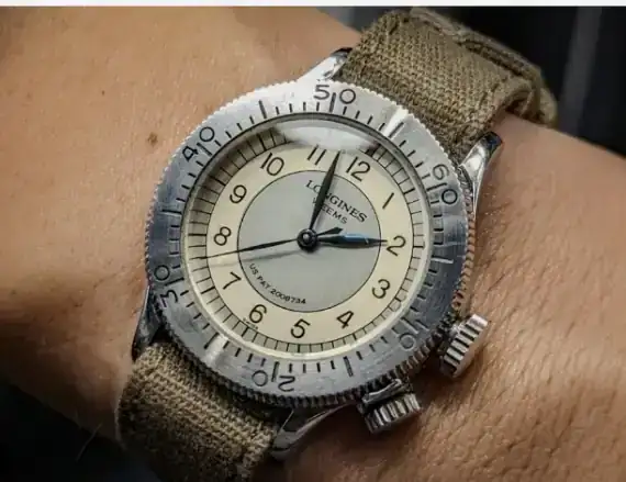 Por lo que se ve, es un reloj inspirado en los 6B/159 de la RAF con bisel giratorio operado por una segunda corona a las 4 (antes de la parada de segundero, era una forma de tomar lecturas al segundo) fabricado en el 40 por marcas como Omega, Zenith… (y luego vinieron las más comunes versiones sin bisel).