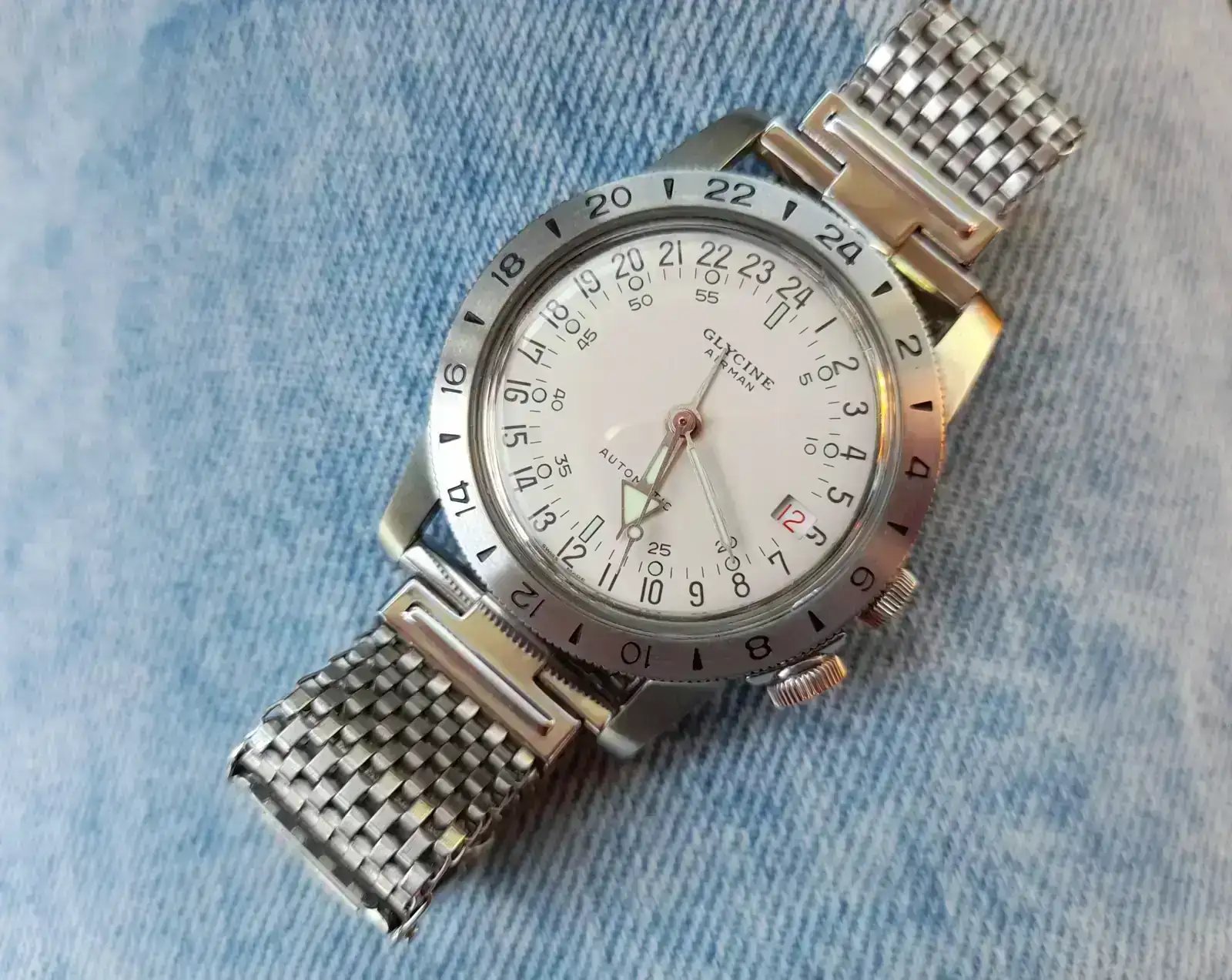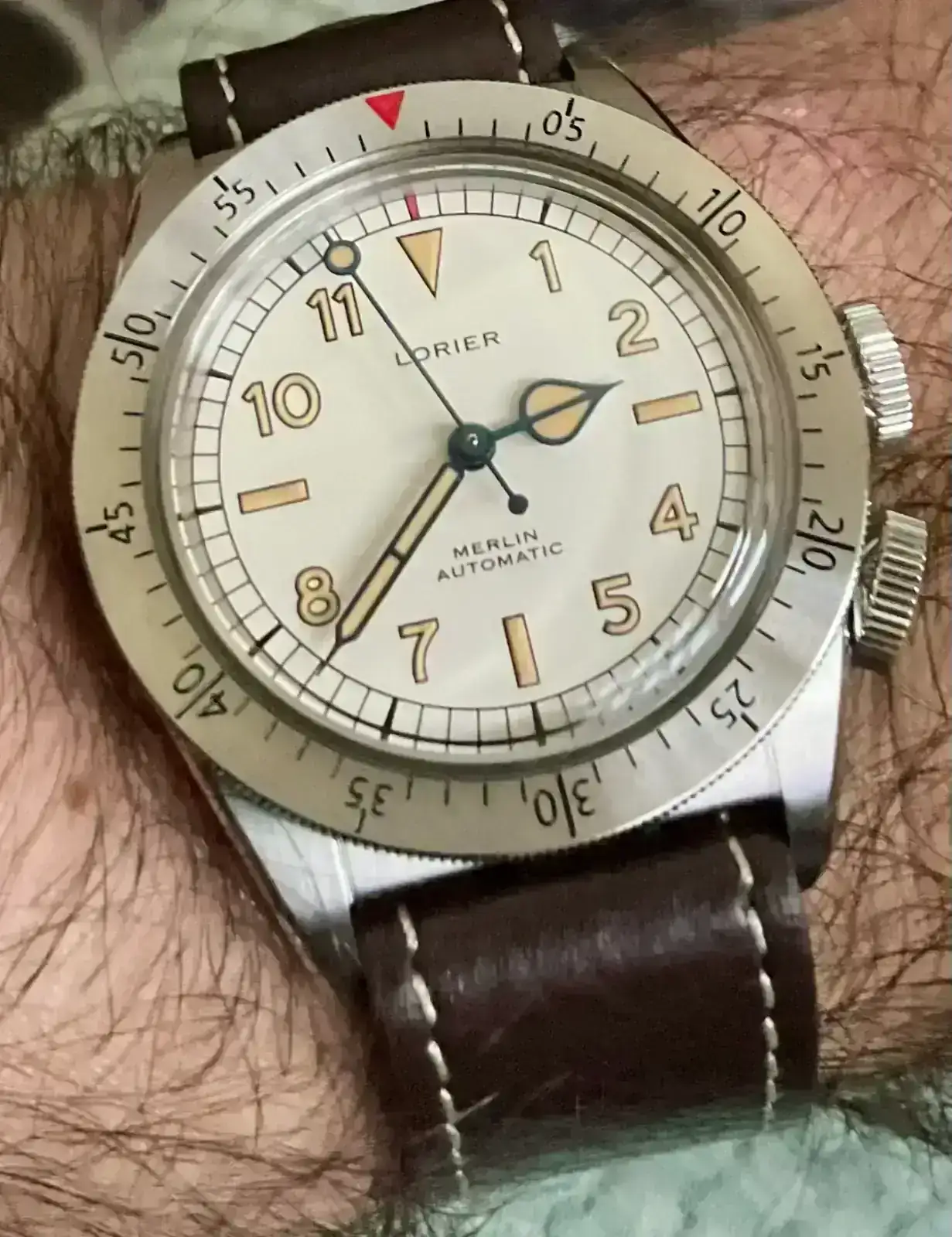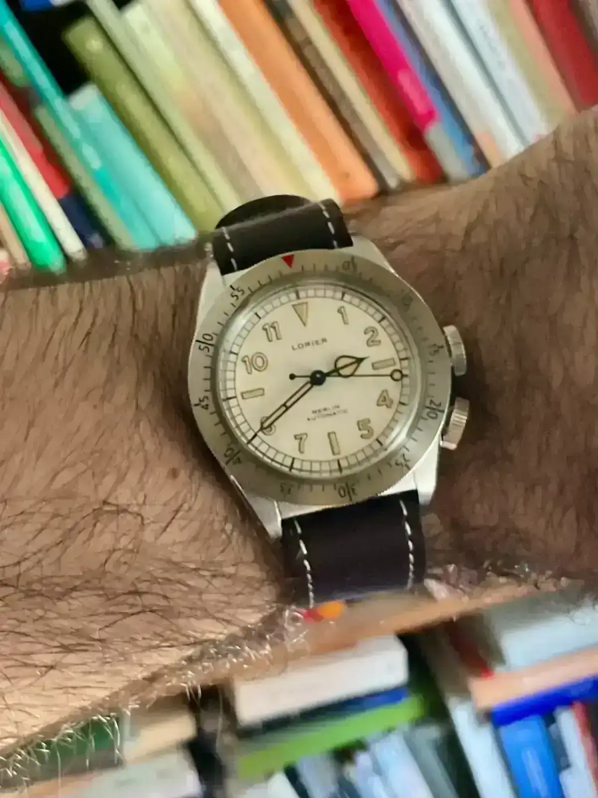Ahora bien, por lo poco que deja ver no pretende ser una recreación histórica (es pena, porque en estos casos me parece justificable y el original es de mis favoritos de la época); tiene triángulo a las 12 en esfera y bisel en lugar de la cifra 12 y 60 respectivamente, numerales lumeados en lugar de impresos en negro y agujas que parecen jeringa o lápiz en lugar de las míticas azuladas en forma lobular o de hoja (esto va a ser lo que más eche en falta, porque me encanta ese tipo de aguja).